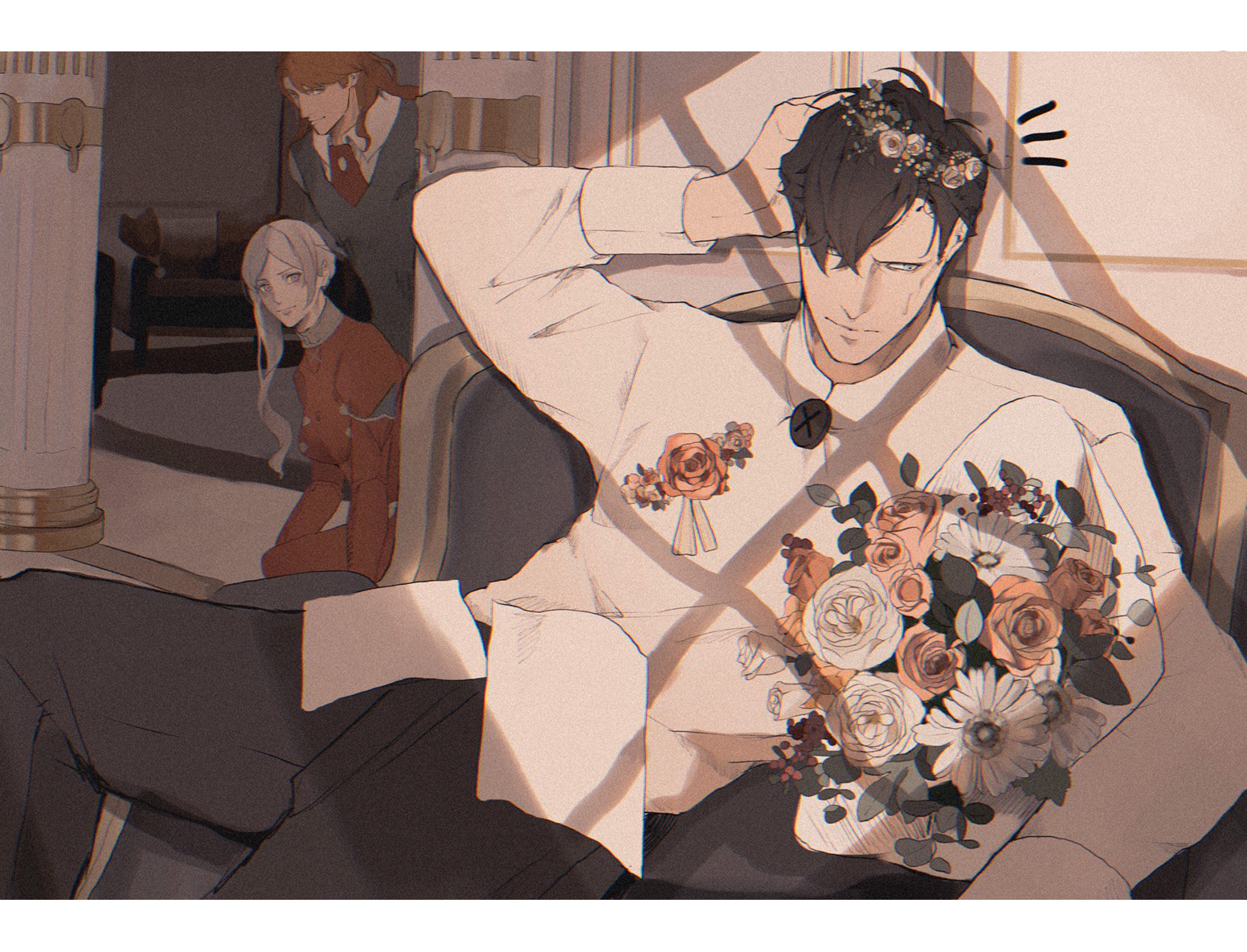 1girl 2boys alternate_costume arm_up banquet black_hair black_pants chair closed_mouth collared_shirt commentary_request dark_room dress edelgard_von_hresvelg edelgard_von_hresvelg_(timeskip) ferdinand_von_aegir ferdinand_von_aegir_(timeskip) fire_emblem fire_emblem:_three_houses flower from_side grey_vest hair_over_one_eye hand_on_own_head head_tilt head_wreath hubert_von_vestra hubert_von_vestra_(timeskip) indoors juliet_sleeves leaning_back leaning_forward leaning_to_the_side long_sleeves male_focus multiple_boys nintendo official_alternate_costume on_chair orange_eyes orange_hair pants paper peeking_out puffy_sleeves purple_eyes red_dress rose shade shirt short_hair side_ponytail sitting sweatdrop user_jdxn7382 vest wavy_hair white_hair white_shirt window_shadow yellow_eyes