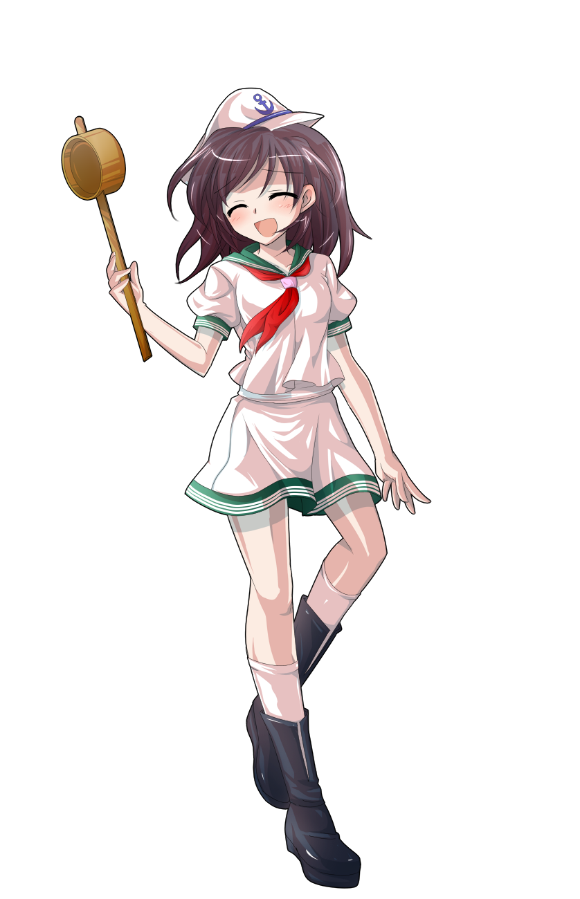 1girl ^_^ anchor_print anchor_symbol arm_at_side black_boots blush boots breasts brown_hair choppy_bangs closed_eyes collarbone commentary_request dairi full_body green_sailor_collar hand_up hat highres hishaku holding kneehighs large_variant_set long_hair medium_breasts miniskirt murasa_minamitsu neckerchief open_mouth pink_hat pink_serafuku pink_shirt pink_skirt pink_socks puffy_short_sleeves puffy_sleeves raised_inner_eyebrows red_neckerchief sailor_collar sailor_hat school_uniform serafuku shirt short_sleeves simple_background skirt smile socks solo standing standing_on_one_leg tachi-e touhou transparent_background variant_set