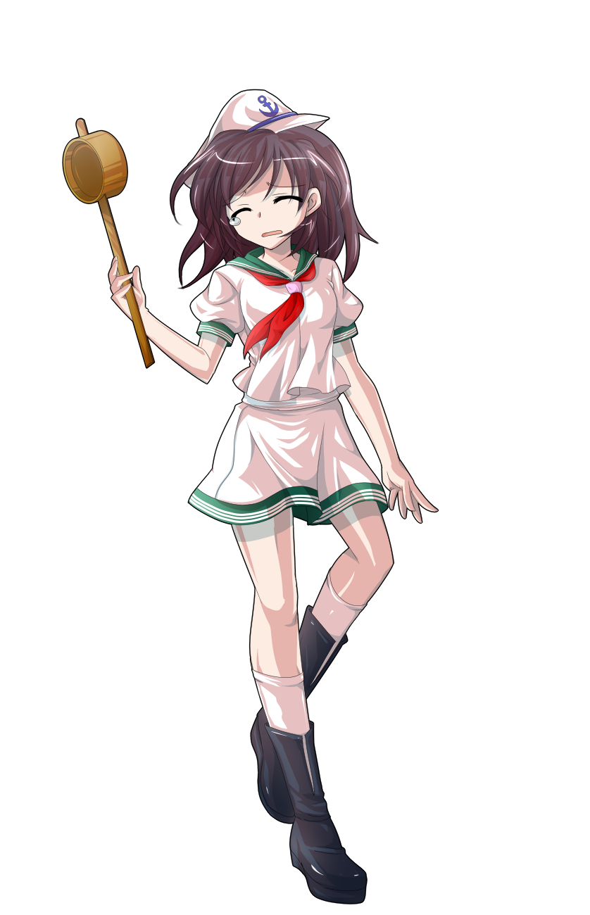 1girl ^_^ anchor_print anchor_symbol arm_at_side black_boots boots breasts brown_hair choppy_bangs closed_eyes collarbone commentary_request dairi facing_viewer full_body green_sailor_collar hand_up hat highres hishaku holding kneehighs large_variant_set long_hair medium_breasts miniskirt murasa_minamitsu neckerchief parted_lips pink_hat pink_serafuku pink_shirt pink_skirt pink_socks puffy_short_sleeves puffy_sleeves raised_inner_eyebrows red_neckerchief sailor_collar sailor_hat school_uniform serafuku shirt short_sleeves simple_background skirt socks solo standing standing_on_one_leg tachi-e tearing_up touhou transparent_background variant_set