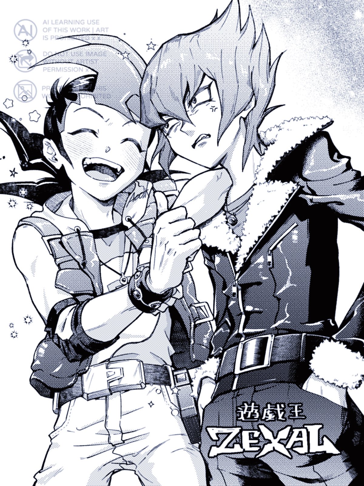 2boys anger_vein belt belt_buckle blush buckle cowboy_shot halftone hands_in_pockets highres jacket jewelry male_focus medium_hair monochrome multicolored_hair multiple_boys nnc_o_nnc pants pendant short_hair tsukumo_yuma two-tone_hair vector_(yu-gi-oh!) vest watermark yu-gi-oh! yu-gi-oh!_zexal