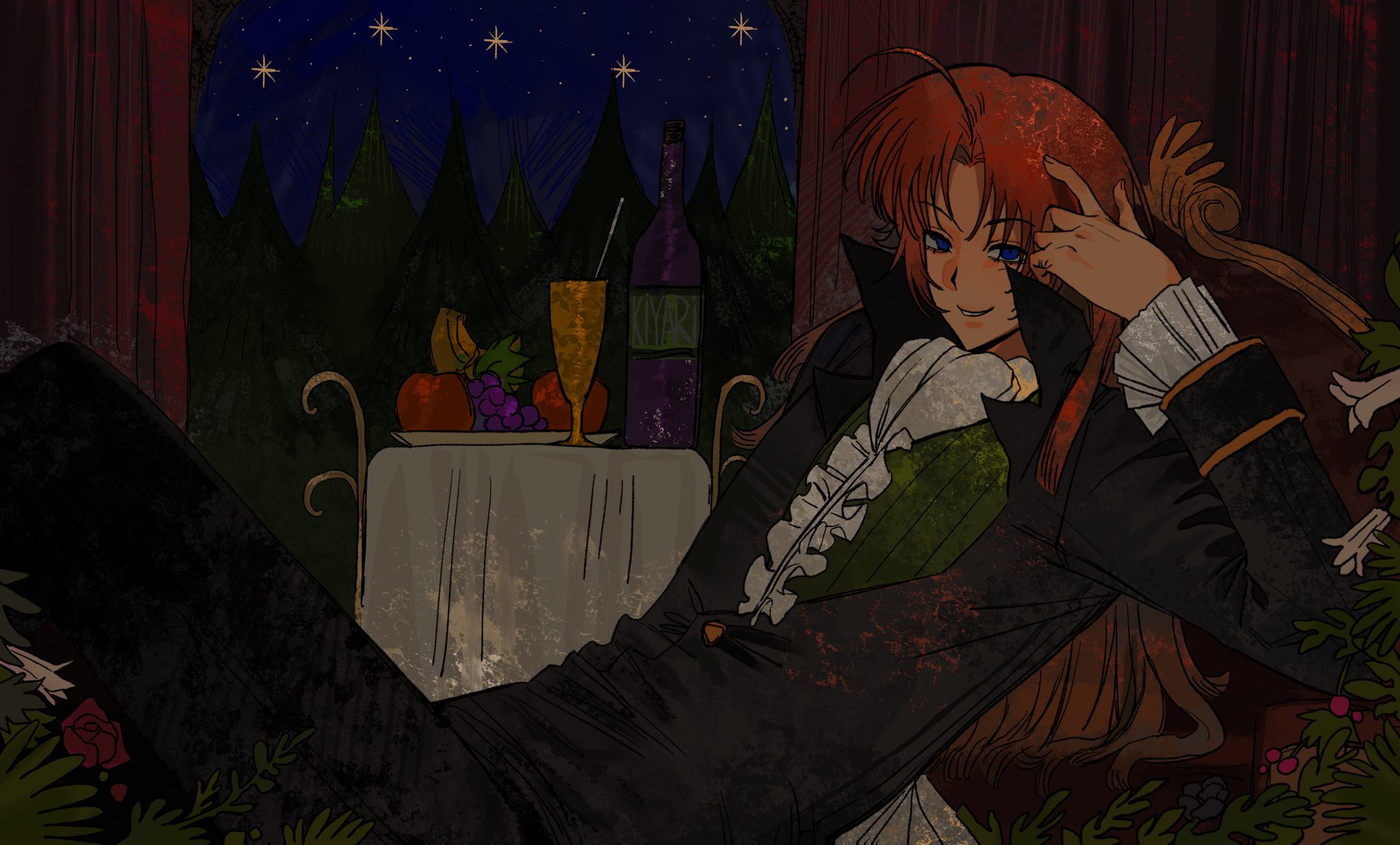 ahoge apple blue_eyes flower food fruit grapes highres kiyari0628 long_hair long_sleeves night original parted_bangs parted_lips red_flower red_rose rose sky smile solo