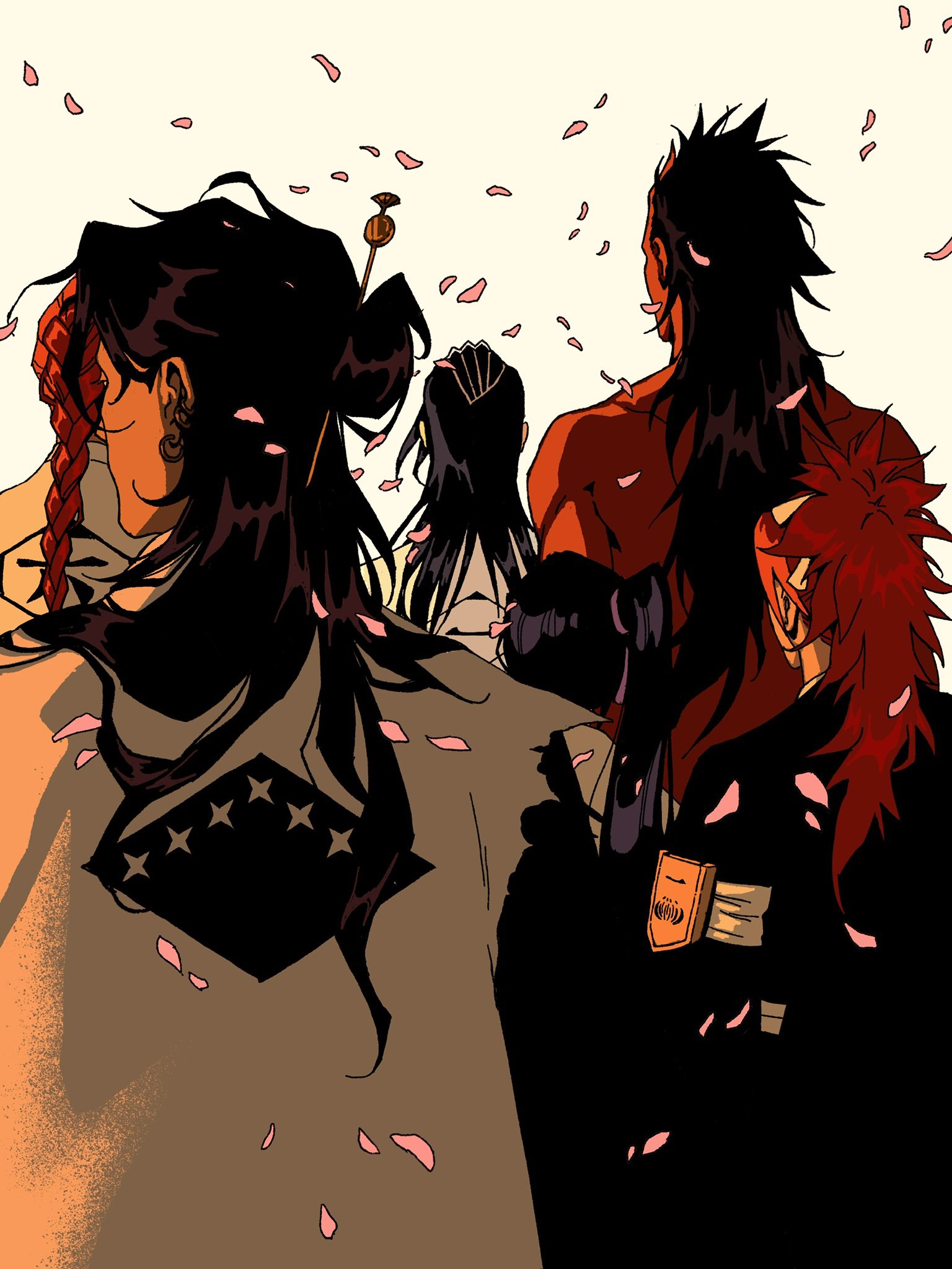 abarai_renji back black_hair black_kimono bleach braid braided_ponytail character_request falling_petals father_and_child father_and_daughter hair_bun half_updo highres japanese_clothes kimono kuchiki_rukia long_hair mother_and_child mother_and_daughter parent_and_child petals pink_petals side_ponytail simple_background size_difference teatimebanter topless_male upper_body