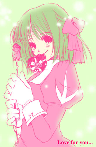 1girl 2000s_(style) bad_id blush bow box closed_mouth dress english_text flower gloves green_background green_hair hair_bow heart-shaped_box holding holding_flower juliet_sleeves long_sleeves looking_at_viewer lowres pink_bow pink_dress pink_eyes priest_(ragnarok_online) puffy_sleeves ragnarok_online rose short_hair simple_background smile solo tachibana_sakuya_(matsurika) upper_body white_gloves