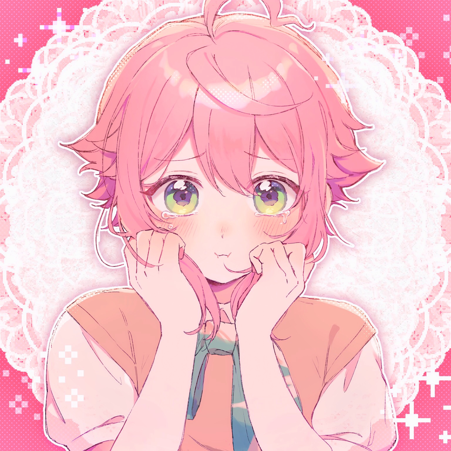 1boy :i ahoge aqua_ribbon blush bunching_hair c54chu0113 cowlick crying crying_with_eyes_open double-parted_bangs ensemble_stars! flipped_hair furrowed_brow green_eyes hands_up highres himemiya_tori holding holding_own_hair lace_background looking_at_viewer male_focus neck_ribbon pink_background pink_theme pixel_art_inset portrait puffy_short_sleeves puffy_sleeves ribbon shirt short_hair short_sleeves sidelocks solo sparkle straight-on sweater_vest tears trap wavy_eyes white_background white_shirt yellow_sweater_vest