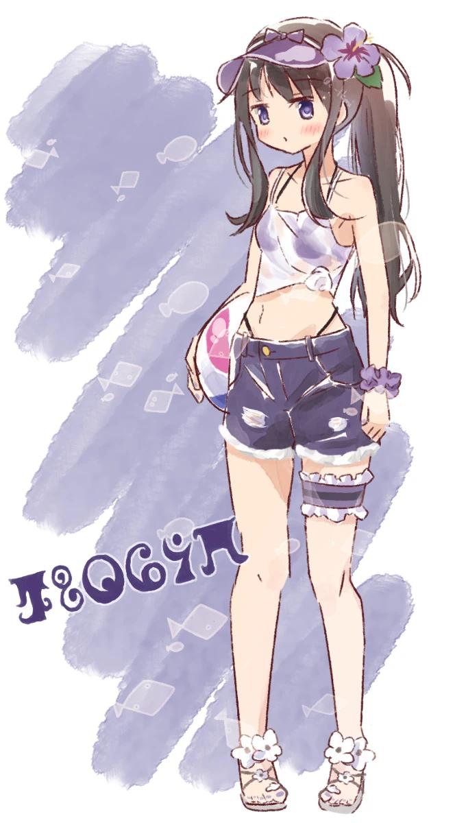 1girl akemi_homura ball bathingsuit beachball black_hair blush bracelet breasts chocolate_blossom flower flowers_in_hair grey_background hair_flower hair_ornament highres jewelry long_hair mahou_shoujo_madoka_magica midriff nail_polish ocean_background pants parted_bangs ponytail purple_flower sandals shirt shorts small_breasts solo_focus strappy_heels swimsuit text_background tied_shirt torn_clothes torn_pants tousled_hair visor_cap white_background white_flower