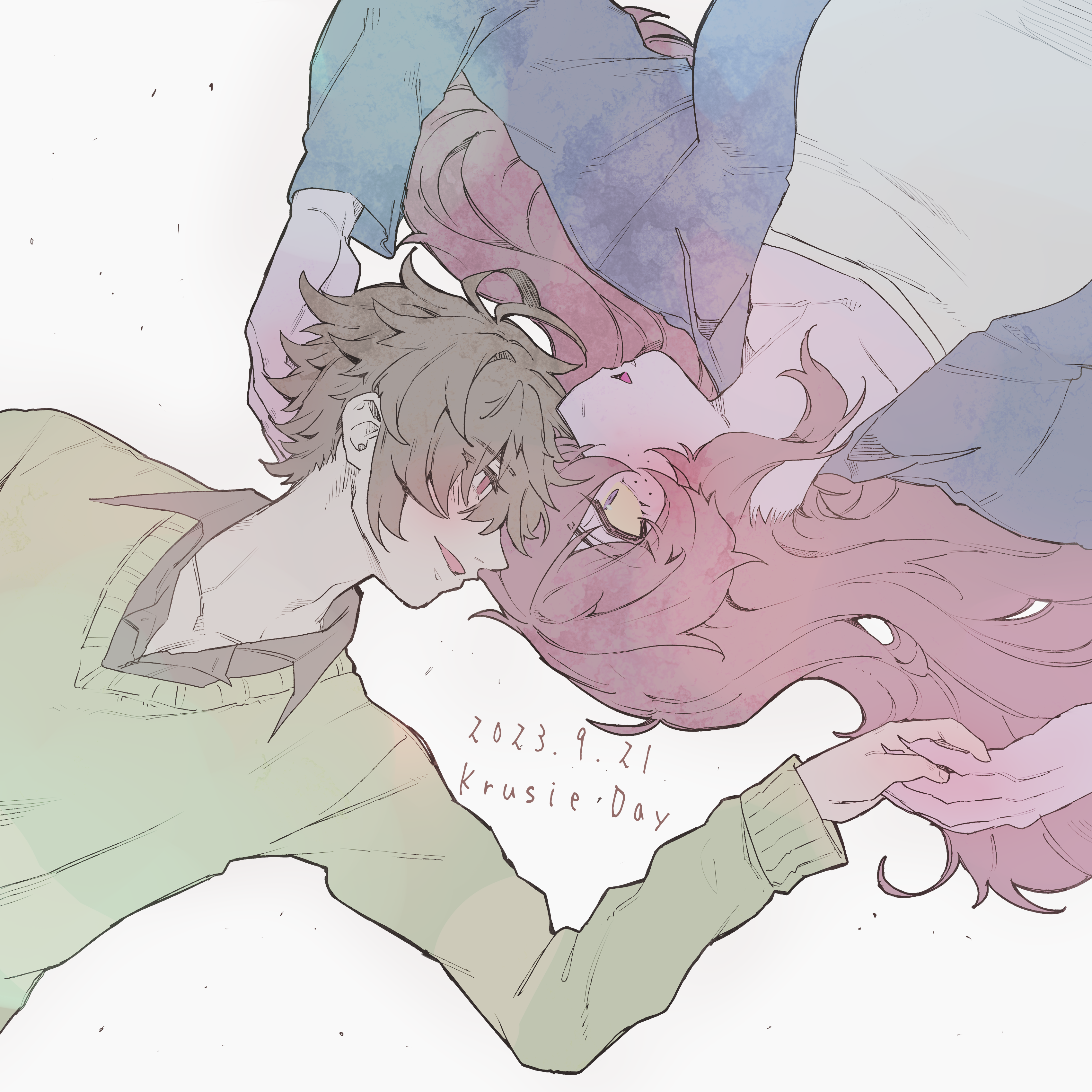 1girl 1other 2023 absurdres adam's_apple blue_coat blush breasts brown_hair coat collarbone collared_shirt colored_sclera colored_skin commentary_request dated deltarune freckles from_above furry furry_female furry_with_non-furry green_sweater grey_shirt hair_spread_out hand_on_another's_head highres holding_hands interspecies komugiko_(bitte_komu) kris_(deltarune) large_breasts long_hair long_sleeves lying on_back open_clothes open_coat open_mouth other_with_female pale_skin parted_lips pink_hair profile purple_eyes purple_skin red_eyes pairing_name shirt short_hair simple_background smile susie_(deltarune) sweater tongue upper_body utdr_(toby_fox) white_background white_shirt yellow_sclera