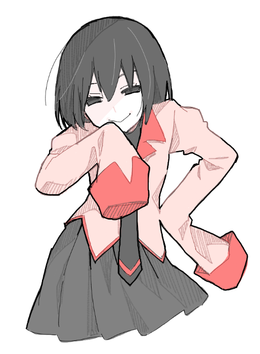 1girl black_eyes black_hair black_necktie black_skirt bob_cut closed_mouth collared_shirt cropped_legs dress_shirt empty_eyes eyelashes hair_between_eyes hand_on_own_hip hand_to_own_mouth hatching_(texture) juliet_sleeves long_sleeves loose_hair_strand manimani_(mani_ma) monogatari_(series) naoetsu_high_school_uniform narrowed_eyes naughty_face necktie oshino_ougi pale_skin pink_shirt pleated_skirt puffy_sleeves red_shirt school_uniform shirt short_hair simple_background skirt sleeves_past_fingers sleeves_past_wrists smile solo turtleneck undershirt white_background