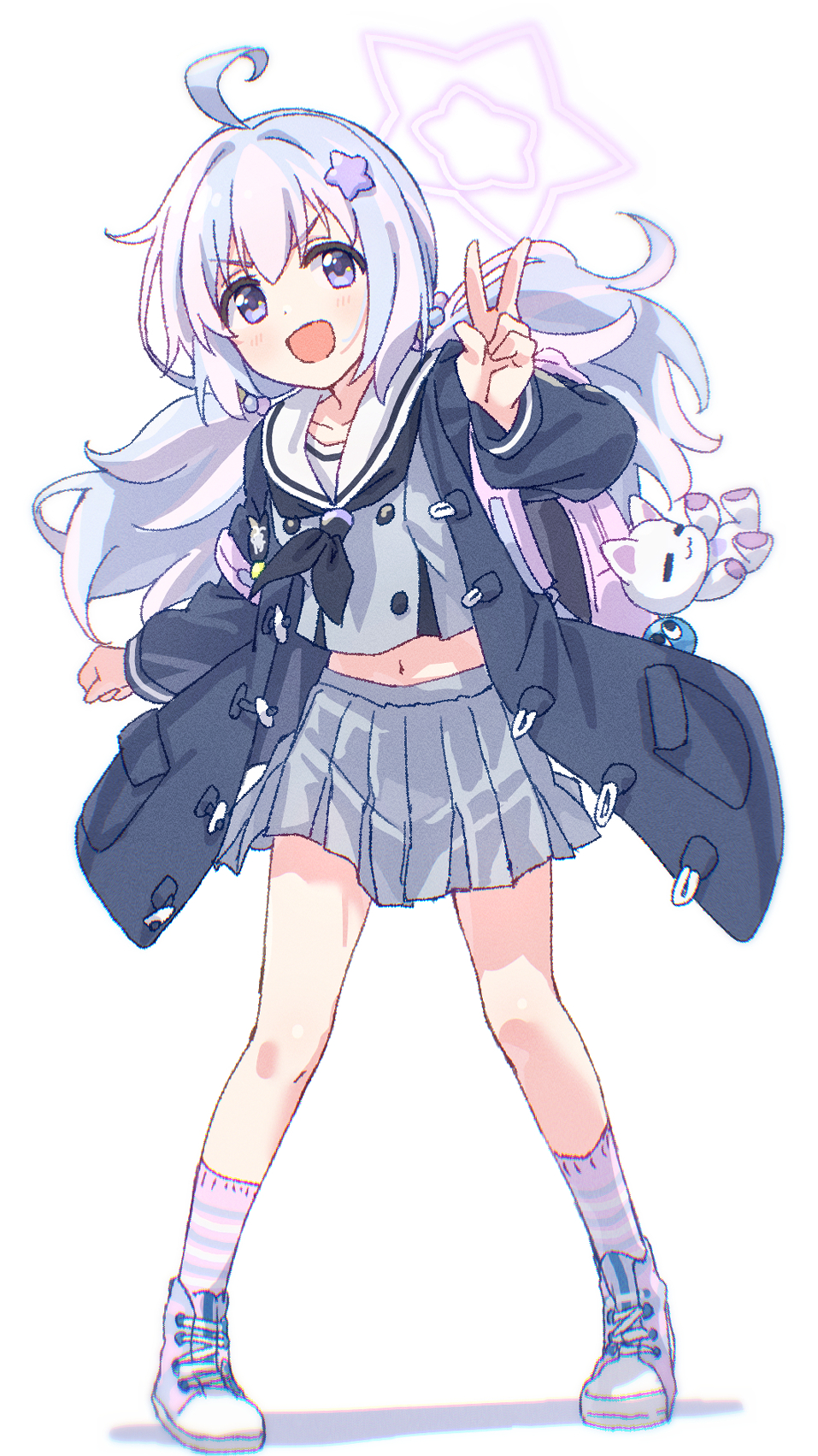 1girl backpack bag bag_charm black_jacket black_neckerchief blue_archive blue_hair blush charm_(object) commentary_request full_body grey_skirt hair_between_eyes hair_ornament halo highres jacket karahai_(31448823) long_hair long_sleeves looking_at_viewer multiple_girls navel neckerchief open_clothes open_jacket open_mouth pink_hair pleated_skirt purple_eyes reisa_(blue_archive) sailor_collar school_uniform serafuku shoes simple_background skirt sneakers socks solo standing star_(symbol) star_hair_ornament striped_clothes striped_socks stuffed_animal stuffed_toy twintails v white_background white_sailor_collar