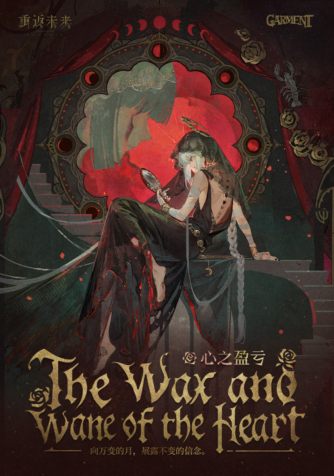 1girl back_tattoo backless_dress backless_outfit bandaged_arm bandages bare_shoulders barefoot black_dress black_nails black_veil bracelet braid chinese_text copyright_name curtains dark_background dress english_text foot_tattoo from_side full_body hair_ornament hand_mirror hand_up highres holding holding_mirror jewelry lace-trimmed_veil lace_trim logo long_braid long_dress long_hair looking_at_mirror mirror moon_phases official_alternate_costume official_art profile red_eyes reverse:1999 semmelweis_(reverse:1999) semmelweis_(the_wax_and_wane_of_the_heart)_(reverse:1999) single_braid sleeveless sleeveless_dress solo stairs tarot tattoo the_moon_(tarot) veil very_long_hair white_hair