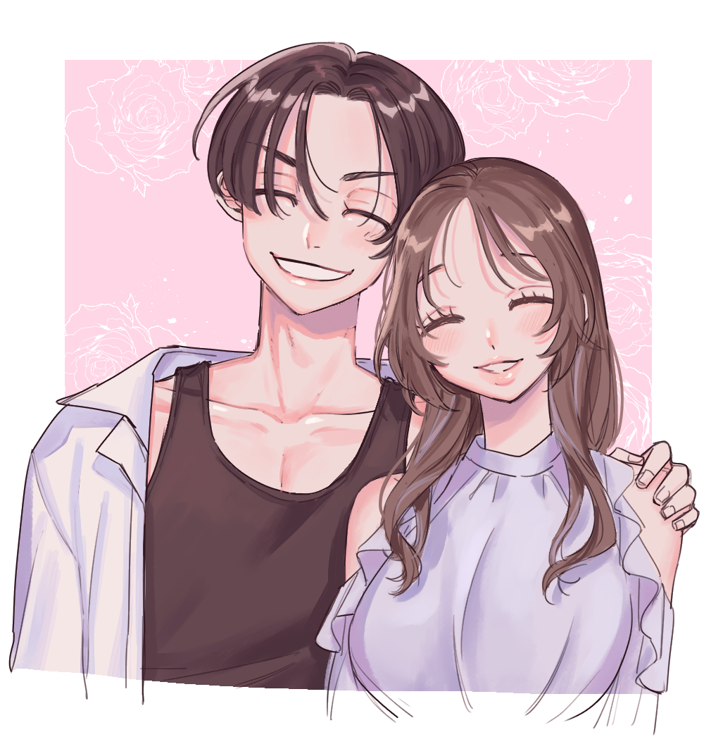 1boy 1girl brown_eyes brown_hair closed_eyes clutching_shoulder couple face-framing_short_strand loose_hair_strand m15391599 parted_bangs round_eyes sano_manjirou sleeveless smile tokyo_revengers