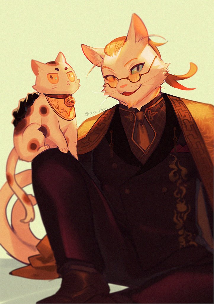 1boy aether_senri_(housamo) black_jacket blonde_hair brown_necktie cat_boy furry furry_and_animal furry_male glasses hair_slicked_back heterochromia jacket looking_at_viewer lucky_cat_(housamo) male_focus multiple_tails necktie open_mouth petting semi-rimless_eyewear simple_background sitting sora-ya_(uya_kyo) tail tinted_eyewear tokyo_houkago_summoners two_tails yellow-tinted_eyewear yellow_eyes