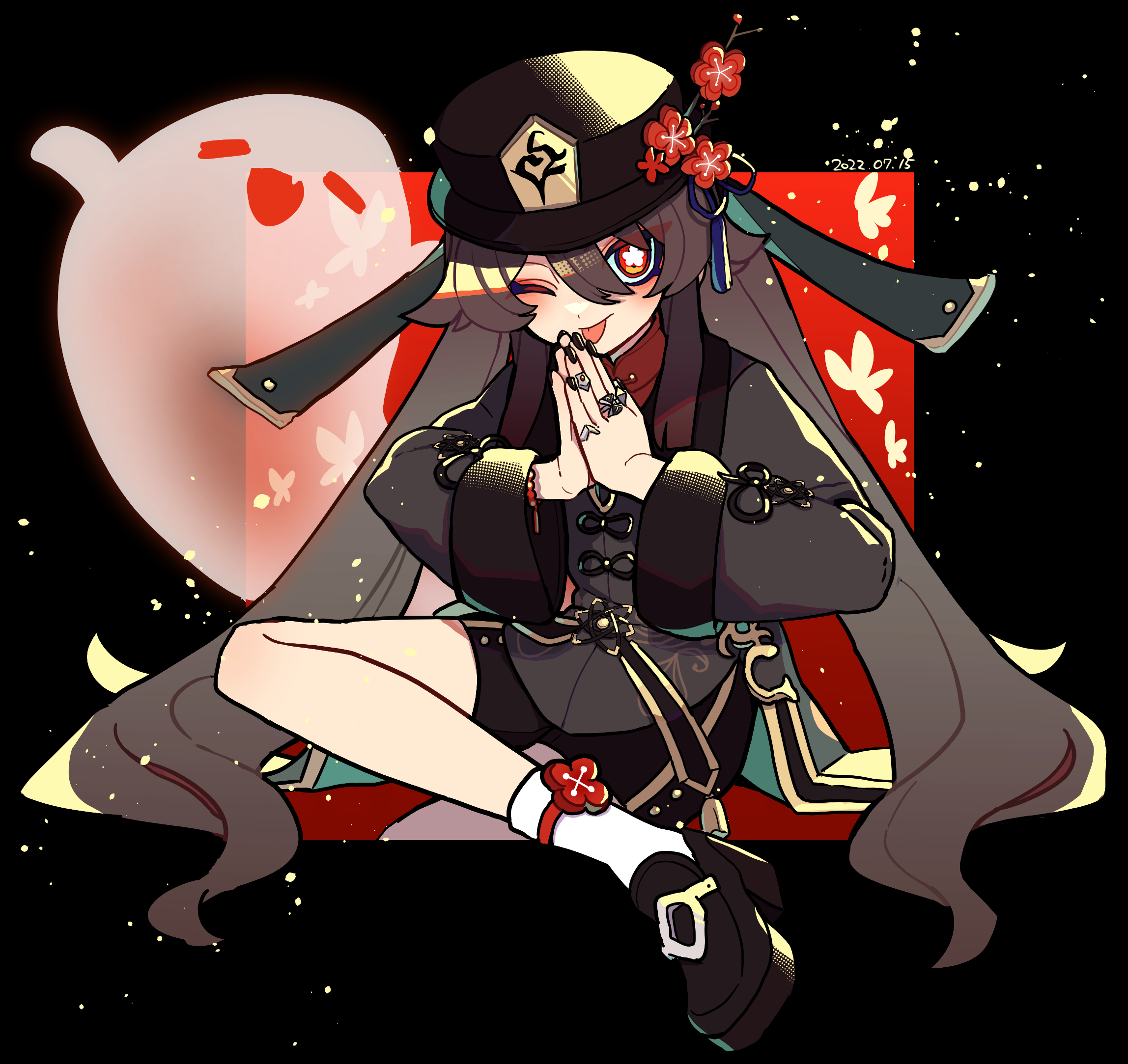 1girl black_nails black_shoes black_shorts blush boo_tao_(genshin_impact) brown_hair bug butterfly commentary_request dated flower flower-shaped_pupils genshin_impact ghost hair_between_eyes hat hat_flower highres hu_tao_(genshin_impact) insect jewelry long_hair long_sleeves mochi_(buchumi10) multiple_rings one_eye_closed own_hands_together red_eyes ring shoes shorts sidelocks sitting socks symbol-shaped_pupils tassel tongue tongue_out twintails very_long_hair white_socks wide_sleeves