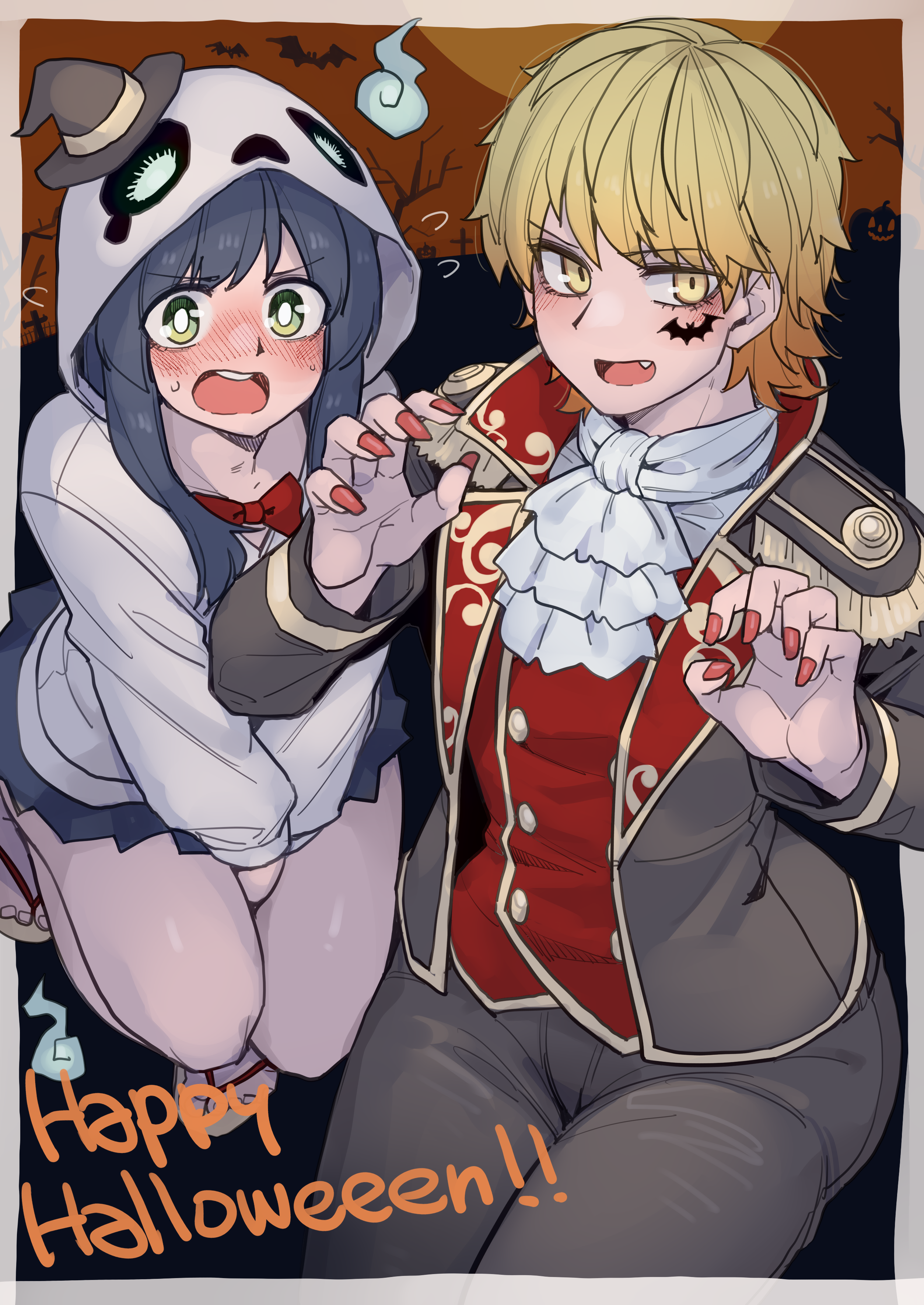 1boy 1girl absurdres akizakura_iori black_hair black_nails blonde_hair blush bow bowtie crossdressing fur_trim green_eyes halloween halloween_costume happy_halloween highres ikemen_joshi_to_josou_danshi jack-o'-lantern long_hair long_sleeves nail_polish open_mouth pants reverse_trap rindou_hazuki school_uniform tadd_(tatd) trick_or_treat yellow_eyes