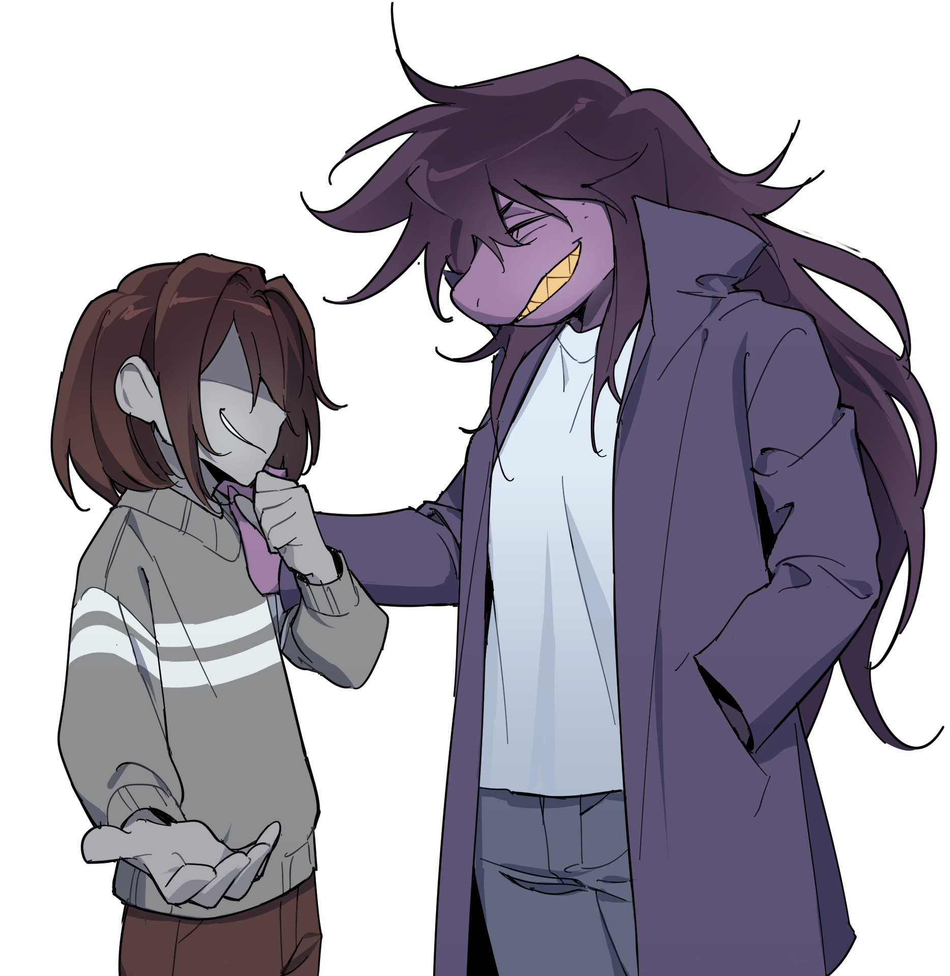 1girl 1other brown_pants closed_eyes coat colored_skin commentary_request deltarune furry furry_female grey_pants grey_skin hand_on_another's_shoulder highres korean_commentary long_hair long_sleeves pants purple_coat purple_hair purple_skin sanbel780308 shaded_face shirt simple_background smile susie_(deltarune) sweater utdr_(toby_fox) vessel_(deltarune) white_shirt