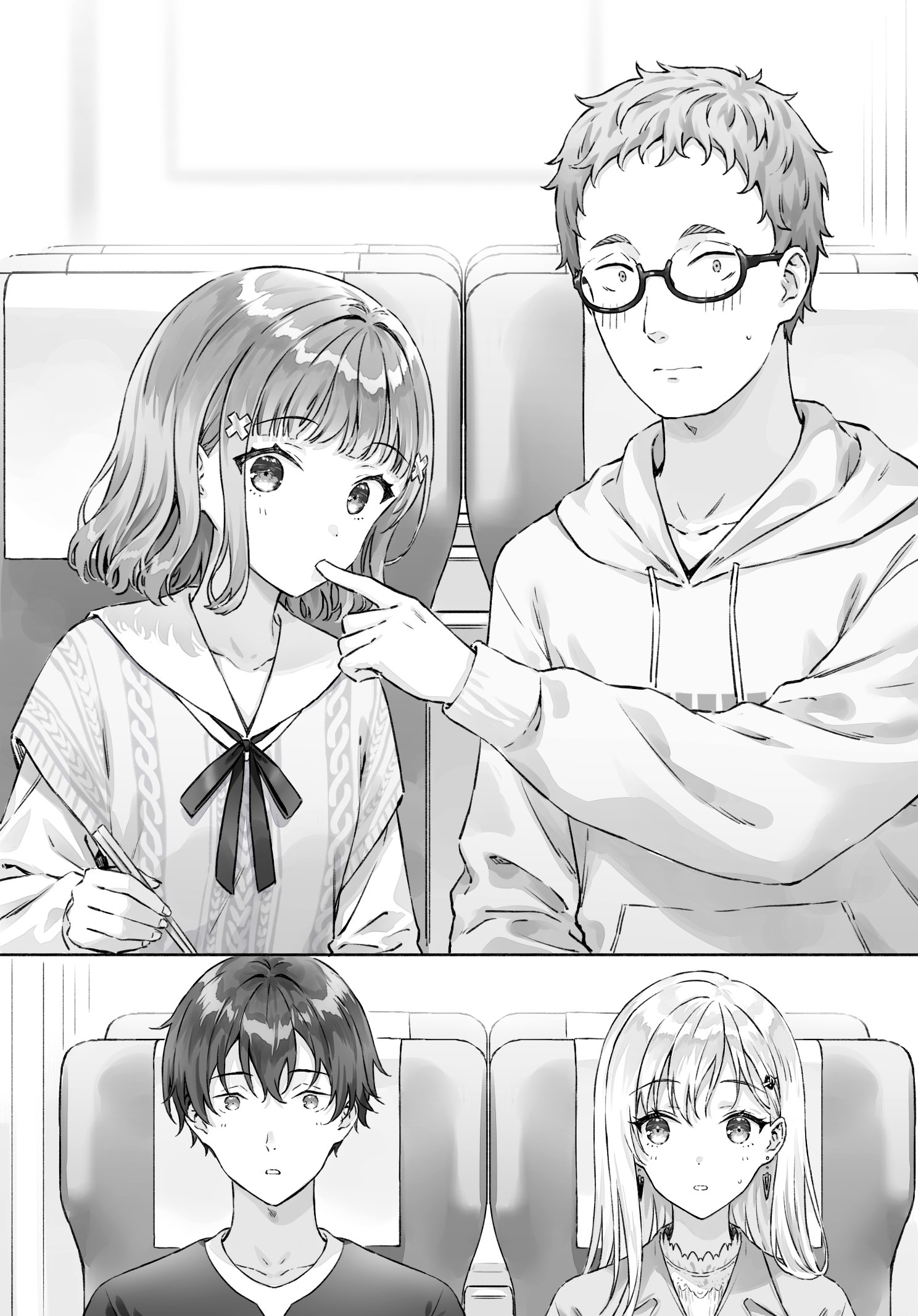 2boys 2girls asamura_yuuta ayase_saki brother_and_sister chopsticks closed_mouth collared_shirt commentary_request earrings finger_in_another's_mouth gimai_seikatsu glasses greyscale hair_ornament hairclip highres hiten_(hitenkei) holding holding_chopsticks hood hoodie jewelry light_blush long_sleeves looking_at_viewer maru_tomokazu medium_hair monochrome multiple_boys multiple_girls narasaka_maaya neck_ribbon novel_illustration official_art parted_lips ribbon second-party_source semi-rimless_eyewear shirt short_hair siblings sitting step-siblings under-rim_eyewear x_hair_ornament