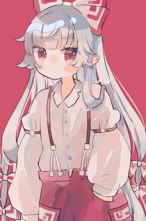 1girl :o blush bow collared_shirt expressionless fujiwara_no_mokou hair_bow hair_ribbon hand_in_pocket hiyuu_(hiyualice) long_hair long_sleeves looking_at_viewer pants red_background red_eyes red_pants ribbon shirt solo touhou very_long_hair white_hair white_shirt