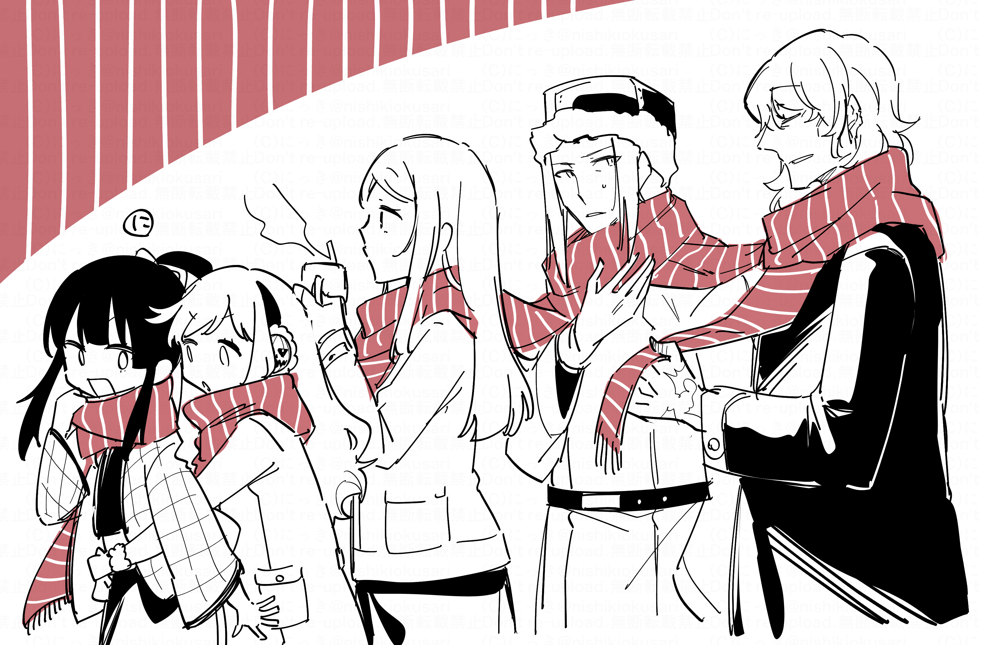 2boys 3girls 5girls absurdres bushidou_(sekaiju) bushidou_2_(sekaiju) coat cup curse_maker curse_maker_1 doctor_magus doctor_magus_4 earmuffs etrian_odyssey fringe_trim fur-trimmed_headwear fur_trim hand_up highres holding holding_cup jacket long_sleeves mug multiple_boys multiple_girls nikki_kyousuke open_mouth paladin_(sekaiju) paladin_2_(sekaiju) ponytail ranger_(sekaiju) ranger_1_(sekaiju) red_scarf scar scarf shared_clothes shared_scarf sidelocks small_sweatdrop striped_clothes striped_scarf sweat vertical-striped_clothes vertical-striped_scarf wide_sleeves