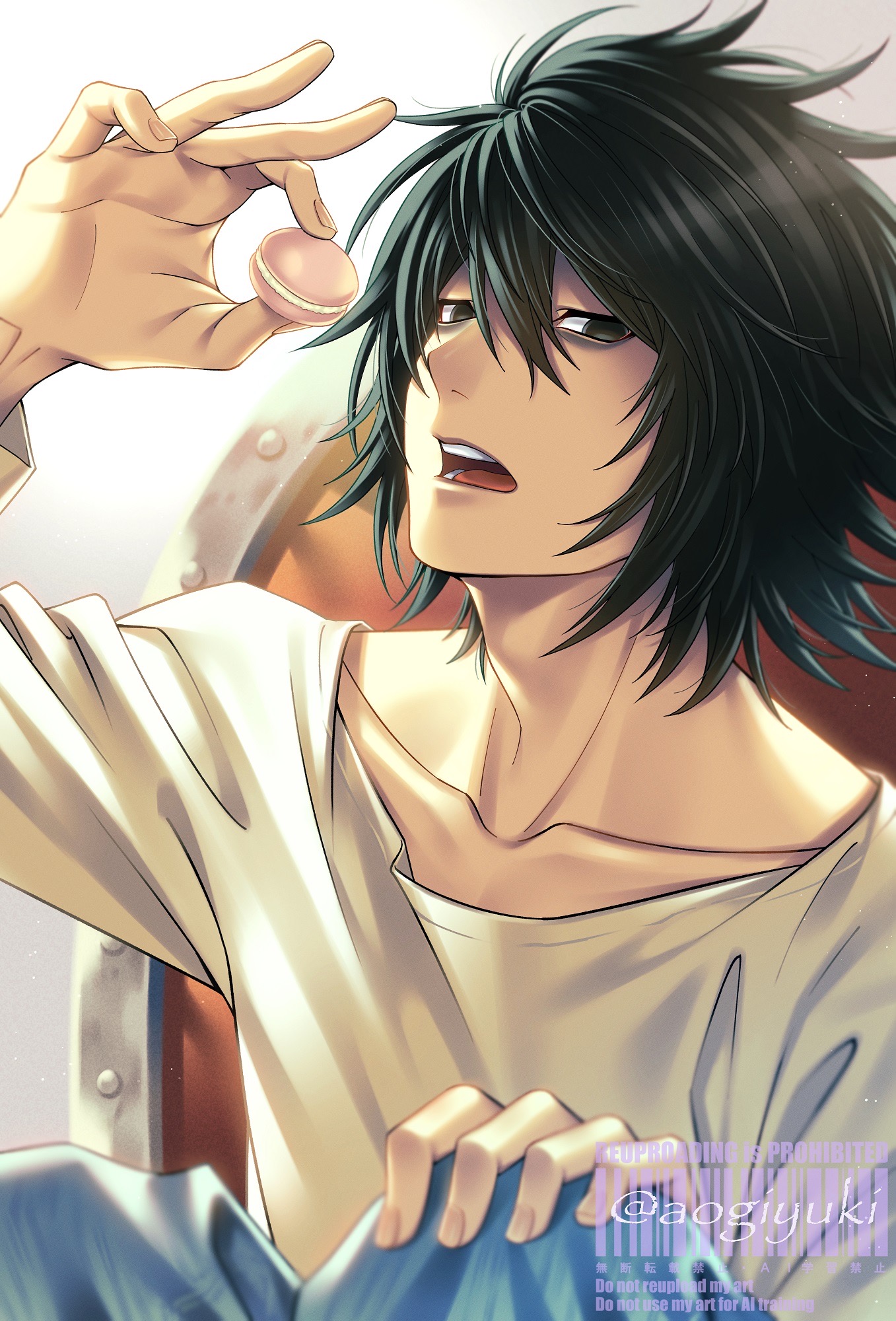 1boy aogiyuki bags_under_eyes black_eyes black_hair blue_pants chair collarbone commentary_request death_note food hand_on_own_knee highres holding holding_food l_(death_note) looking_at_viewer looking_to_the_side macaron male_focus on_chair open_mouth pants shirt short_hair sitting solo teeth twitter_username upper_body white_background white_shirt