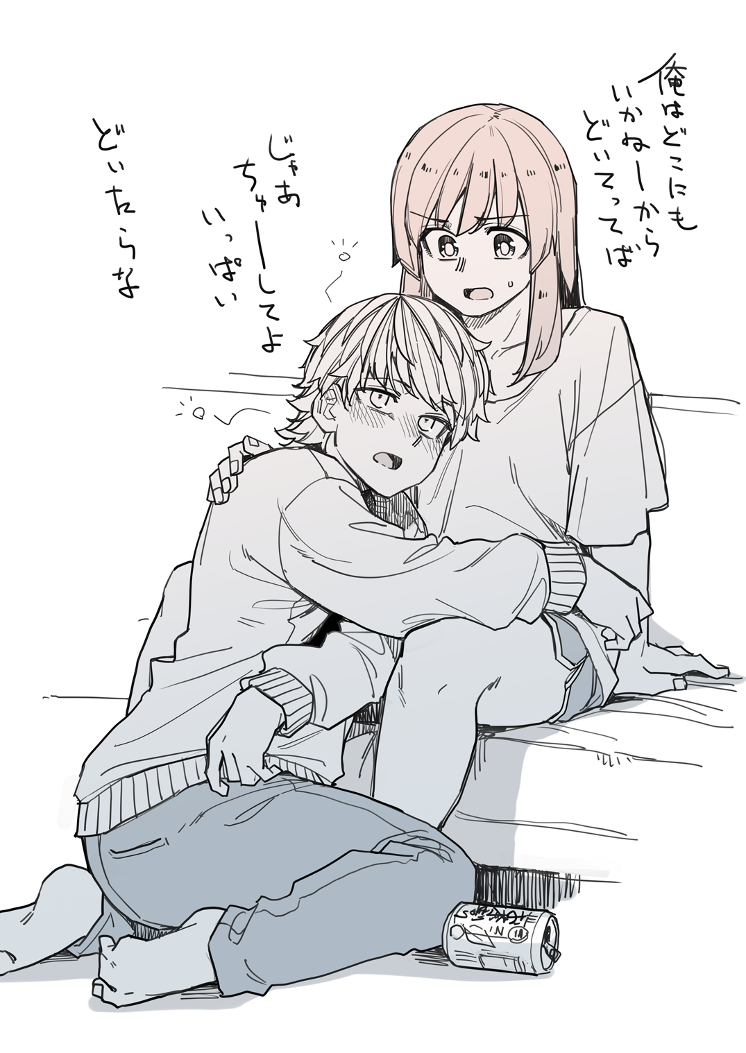 1boy 1girl akizakura_iori barefoot blush can couple dolphin_shorts highres hug ikemen_joshi_to_josou_danshi long_hair monochrome open_mouth pants rindou_hazuki shorts sitting tadd_(tatd)