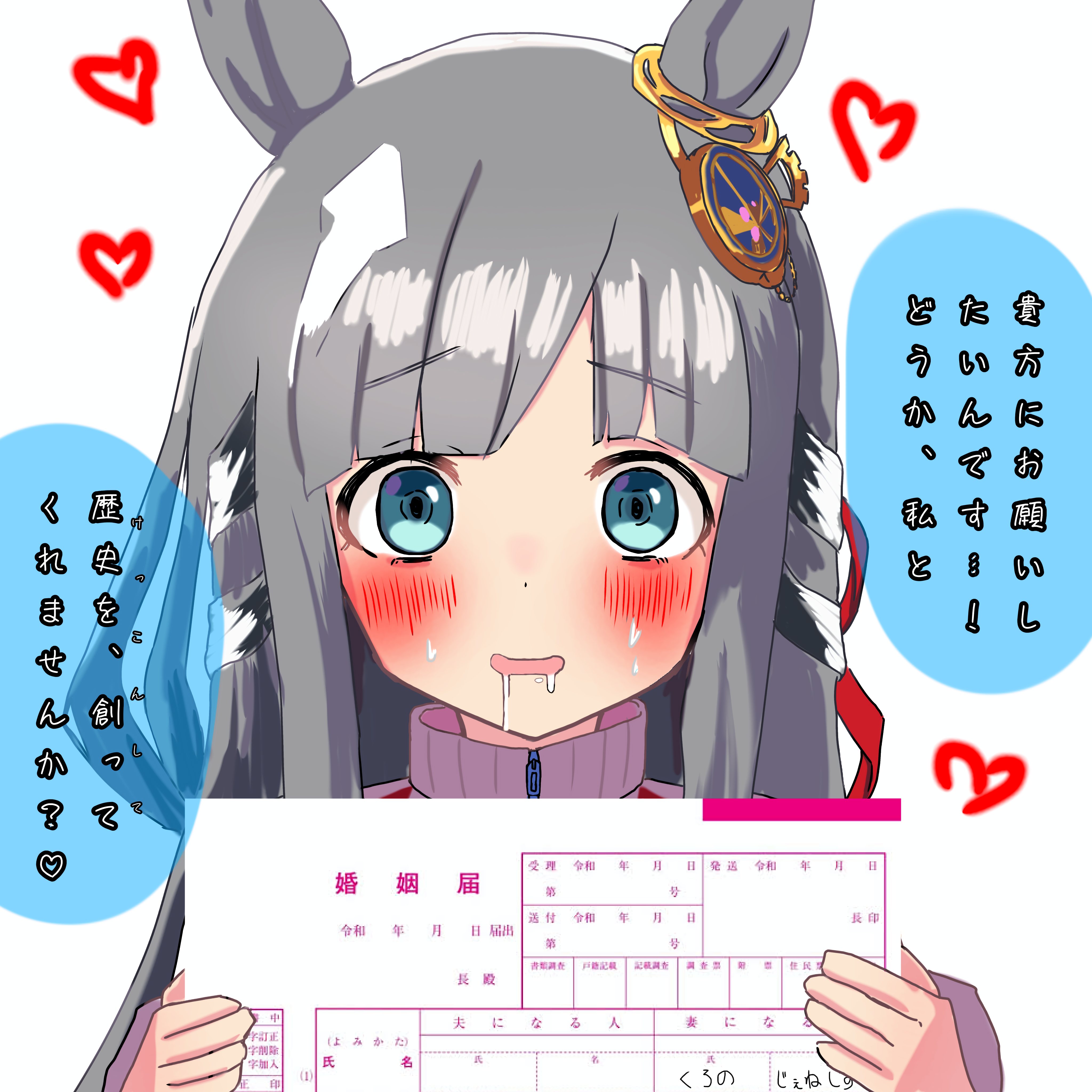 1girl absurdres alternate_costume animal_ears blue_eyes blunt_bangs blush chrono_genesis_(umamusume) commentary_request grey_hair hair_between_eyes hair_ornament heart highres holding horse_ears jacket long_hair looking_at_viewer marriage_certificate_(object) open_mouth paper portrait saliva solo sweat track_jacket translation_request umamusume white_background ysok_(user_vexx4838)