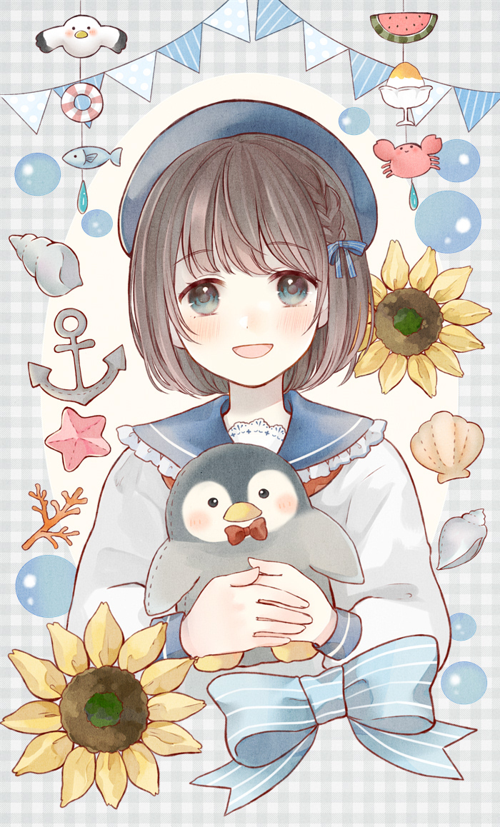 1girl anchor beret blue_bow blue_eyes blue_hat blue_sailor_collar blush bow braid brown_hair commentary_request coral crab cropped_torso dot_nose fish flower food frilled_sailor_collar frilled_shirt_collar frills fruit hair_bow hat holding holding_stuffed_toy long_sleeves looking_at_viewer neckerchief open_mouth original plaid_background puffy_long_sleeves puffy_sleeves red_neckerchief sailor_collar seashell shell shirt short_hair side_braid smile solo star_(symbol) straight-on striped_bow stuffed_animal stuffed_penguin stuffed_toy sunflower tententuyu upper_body watermelon watermelon_slice white_shirt