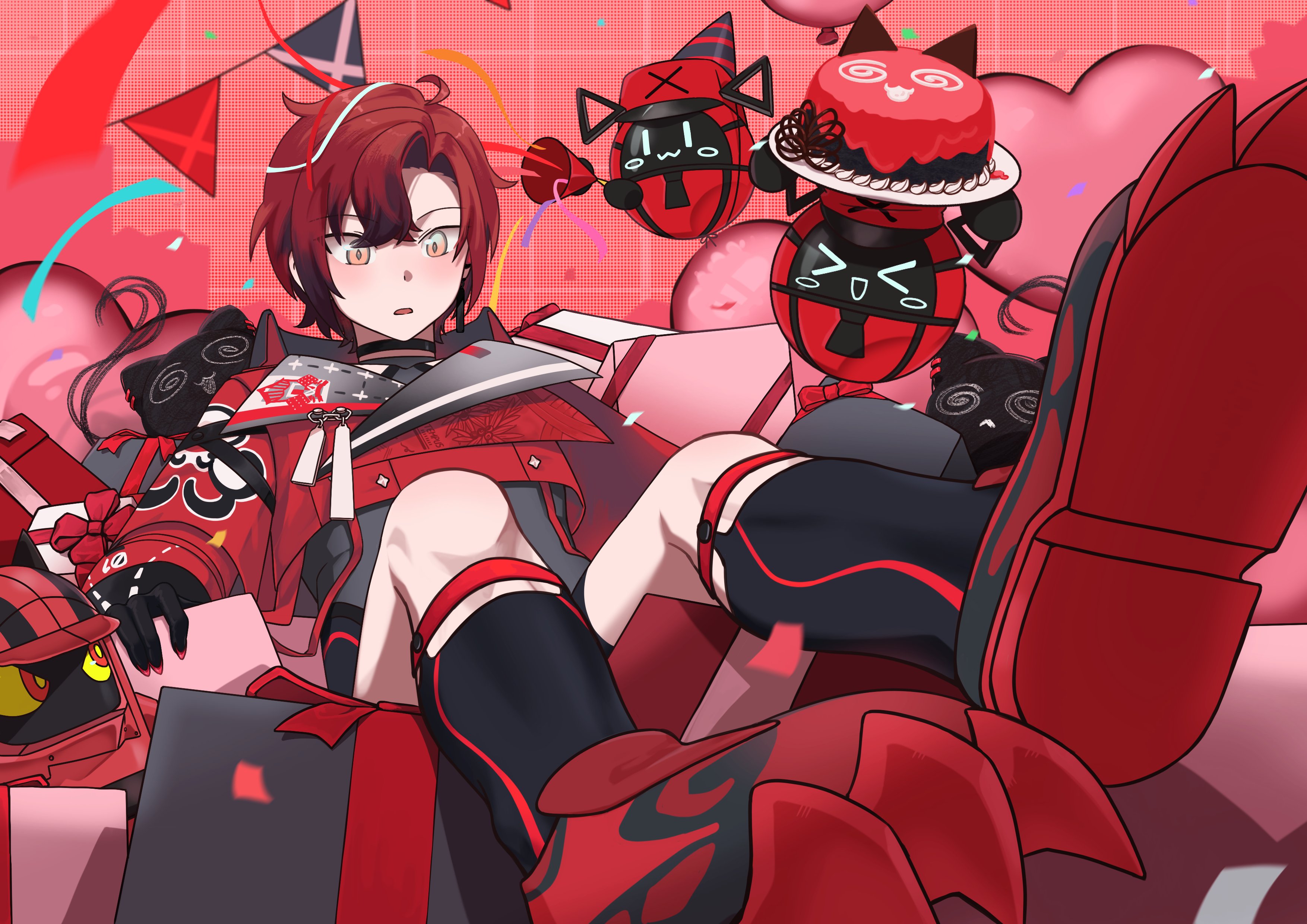>_< 1boy absurdres birthday_cake black_gloves black_socks blush boots box cake coat confetti food gift gift_box gloves happy_birthday highres holding holostars holostars_english legwear_garter long_hair looking_at_viewer machina_x_flayon machiroon_(machina_x_flayon) male_focus nasvy open_mouth parted_lips party_popper red_coat red_eyes red_hair short_hair shorts sitting socks solo thighs weapon