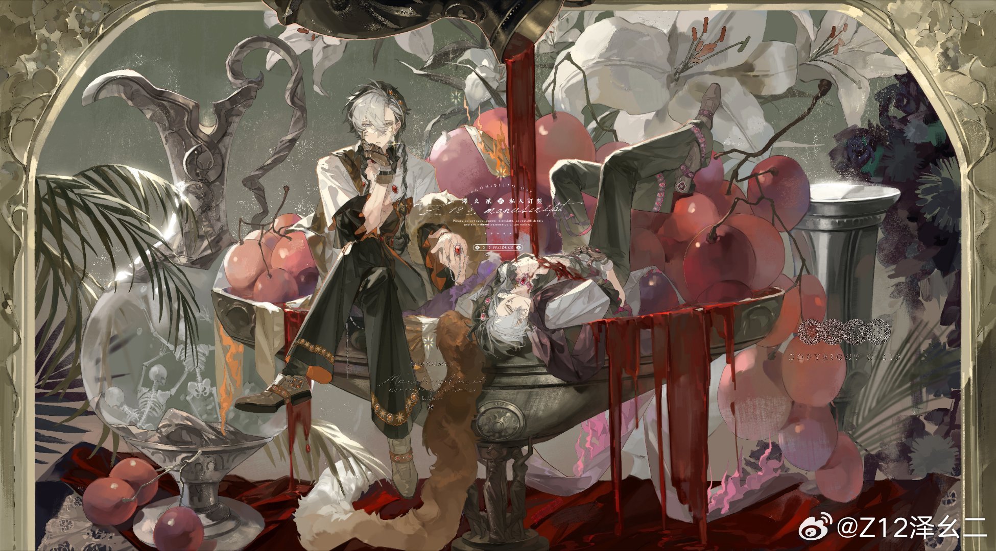 2boys alcohol black_hair black_pants black_shirt border borrowed_character braid brooch closed_mouth crossed_legs dual_persona expressionless facial_mark feather_boa final_fantasy final_fantasy_xiv flower food fruit fruit_bowl gauntlets gem grapes grey_eyes grey_shoes hair_between_eyes hair_ornament hair_over_shoulder hand_on_own_stomach head_rest heterochromia highres holding_hands hyur jacket jewelry jug_(bottle) lily_(flower) long_hair long_sleeves looking_at_viewer lying male_focus mini_person miniboy multicolored_hair multiple_boys murrtecys_ansuz necklace on_back open_clothes open_jacket open_shirt original ornate_border pants plant pouring red_gem ring shirt shoes short_hair side_part single_braid sitting skeleton three-quarter_sleeves two-tone_hair warrior_of_light_(ff14) watermark weibo_watermark white_flower white_hair white_jacket white_lily white_shoes wine yellow_eyes z12_ze_yao_er