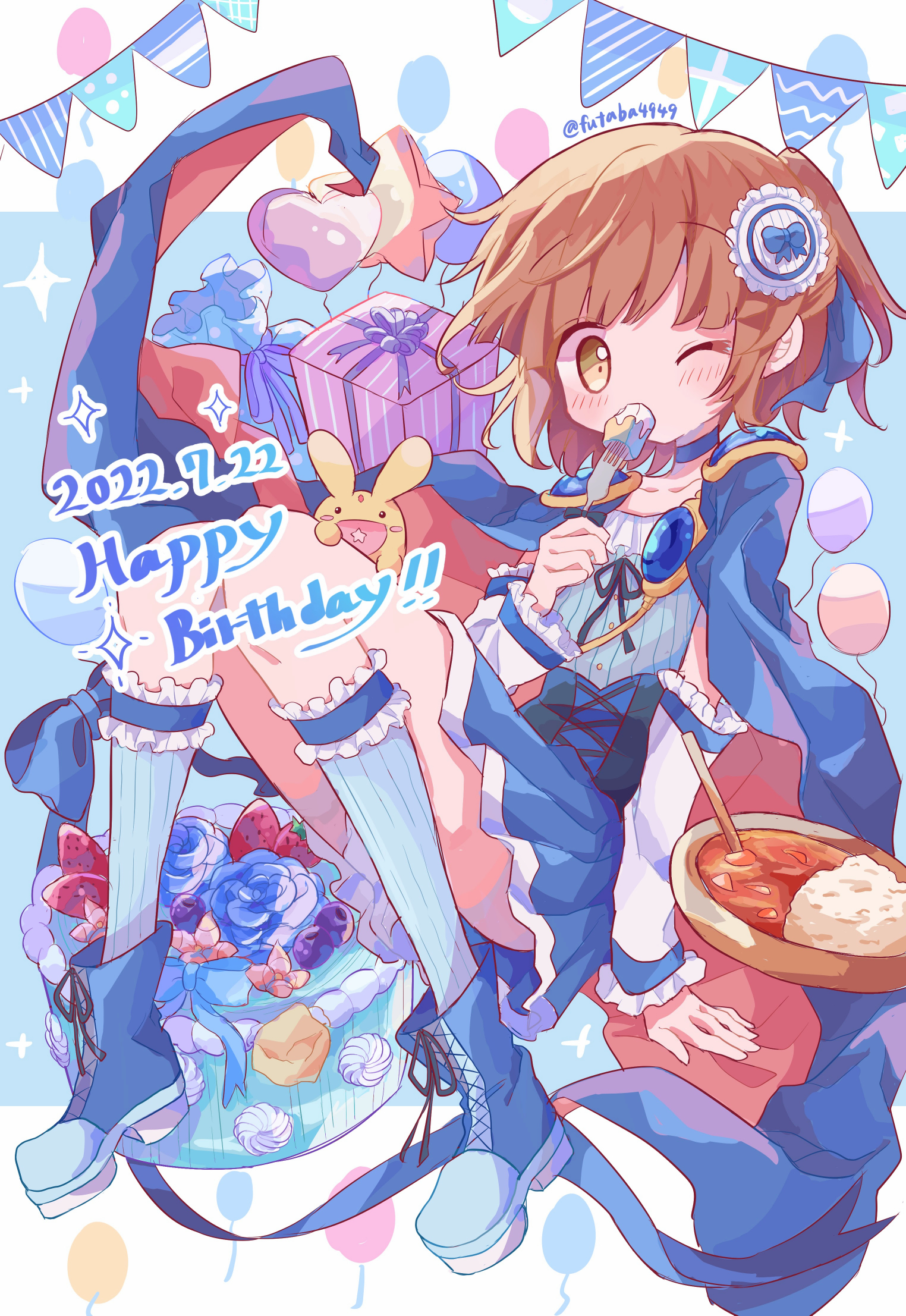 1girl arle_nadja balloon birthday_cake blue_boots blue_cape blue_skirt blue_thighhighs blush boots brown_hair cake cape carbuncle_(puyopuyo) commentary_request curry curry_rice flower food full_body futaba969649 gift happy_birthday heart highres looking_at_viewer madou_monogatari one_eye_closed puyopuyo rice sitting skirt thighhighs yellow_eyes