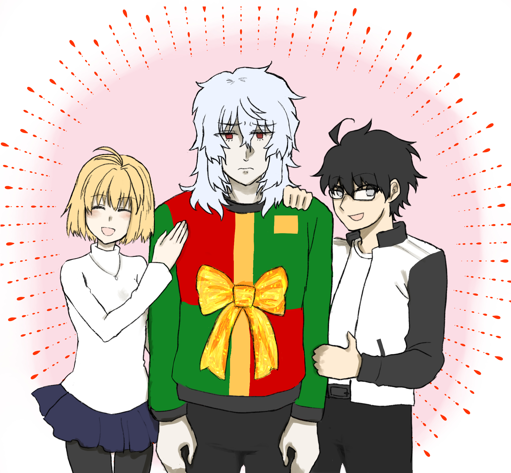 1girl 2boys ahoge arcueid_brunestud black_eyes black_pants blonde_hair blush christmas_sweater expressionless glasses hair_between_eyes hands_on_shoulders highres i_touhu jacket jewelry looking_at_viewer multiple_boys necklace pants pantyhose red_eyes shirt short_hair skirt sweater tohno_shiki tsukihime tsukihime_(remake) turtleneck turtleneck_sweater ugly_sweater vampire vlov_arkhangel white_hair white_shirt