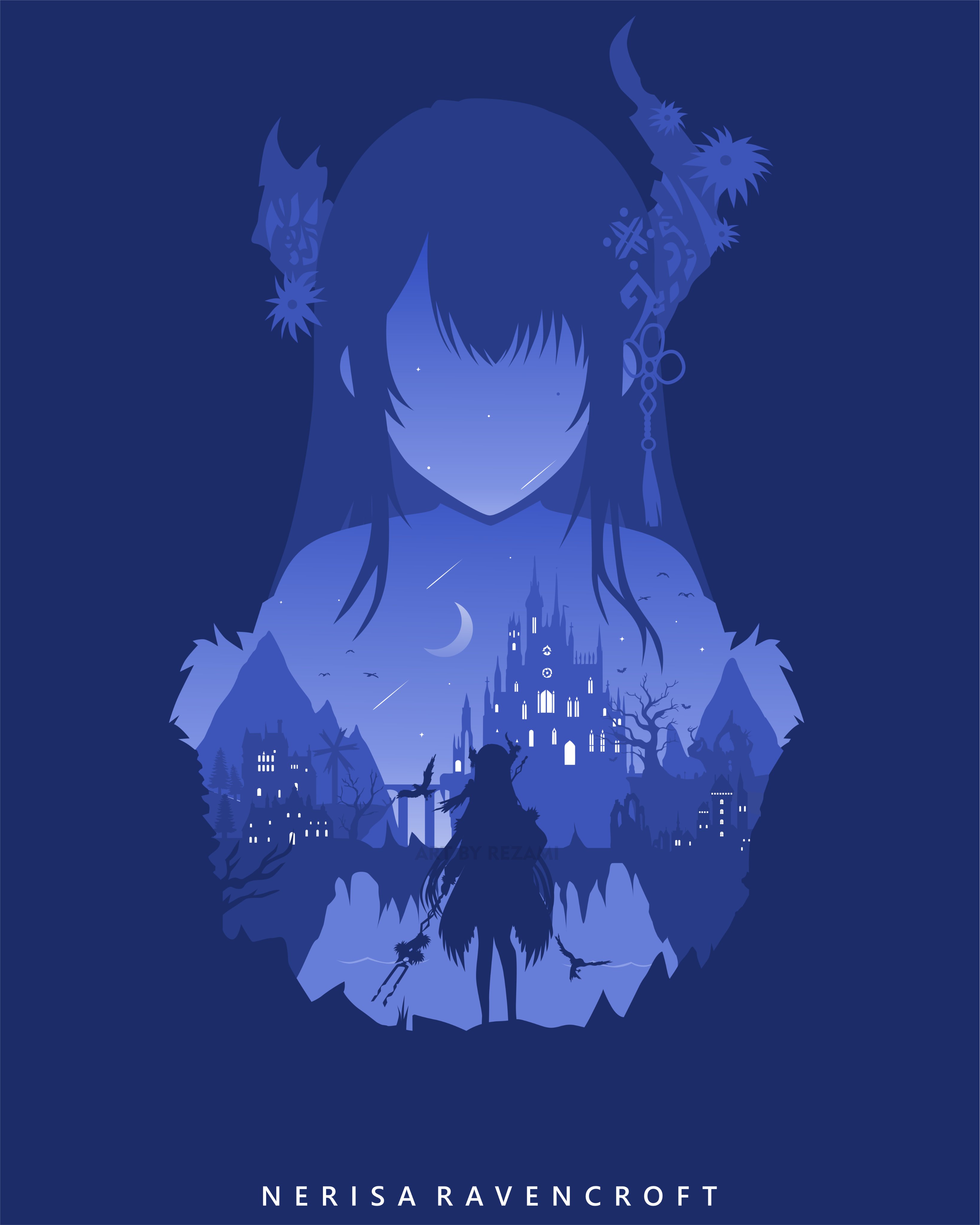 1girl absurdres artist_name asymmetrical_horns building character_name crescent_moon highres holding holding_polearm holding_weapon hololive hololive_english horns long_hair moon multiple_views nerissa_ravencroft nerissa_ravencroft_(1st_costume) polearm rezami shooting_star silhouette star_(sky) tree virtual_youtuber water weapon