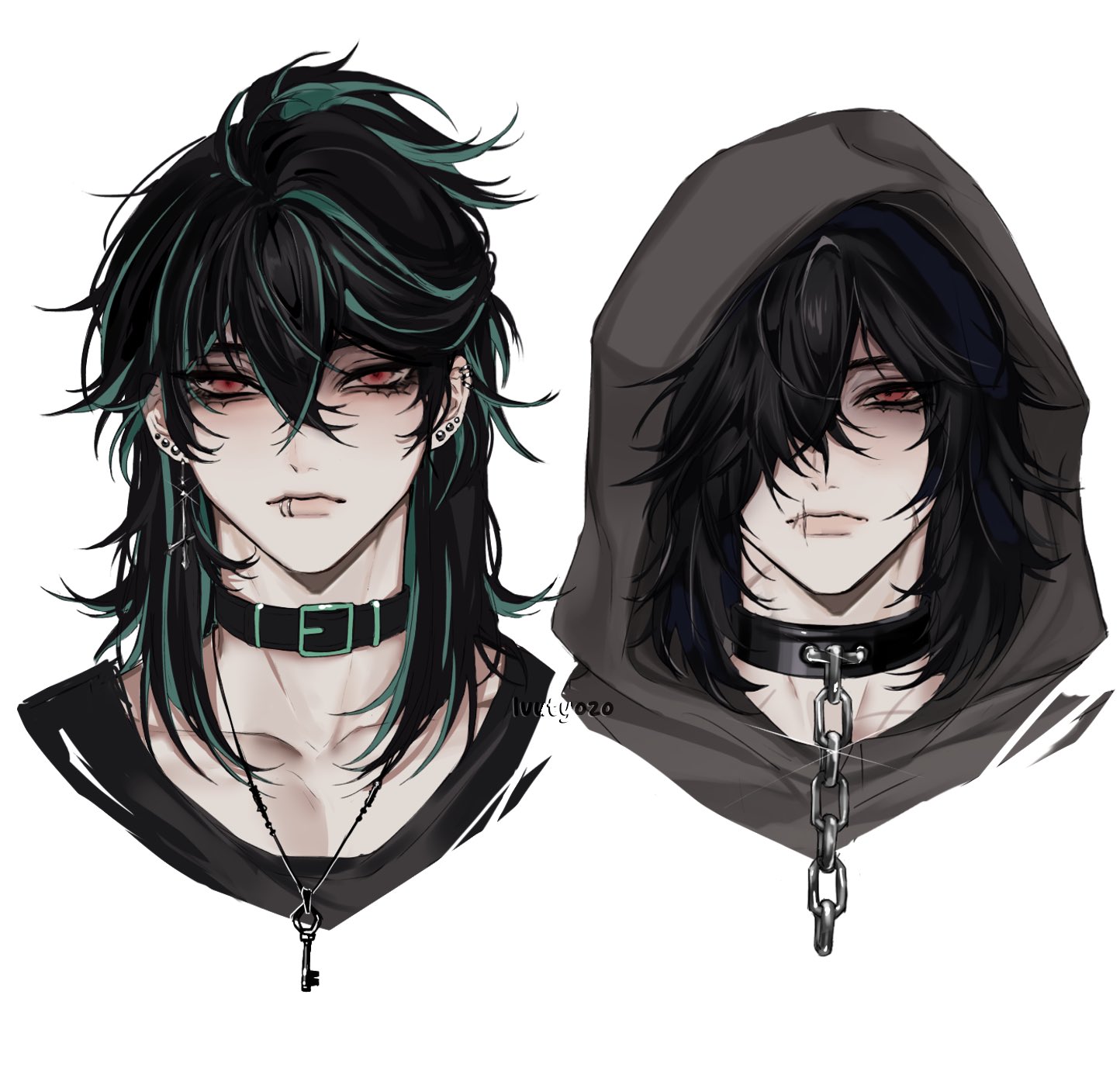 1boy artist_name black_collar black_hair collar earrings face_piercing green_streaks grey_hood highres ivutyozo jewelry lip_piercing long_hair looking_at_viewer multicolored_hair multiple_views necklace piercing pink_eyes solivan_brugmansia streaked_hair the_kid_at_the_back