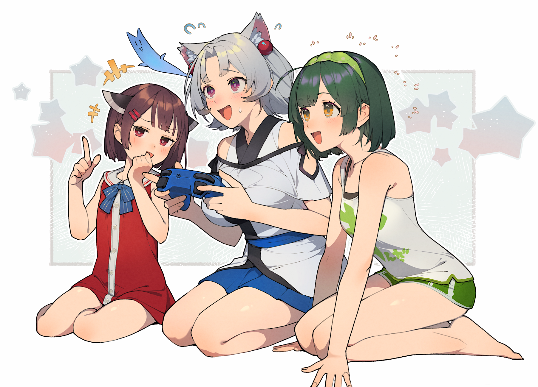 3girls animal_ear_fluff animal_ears barefoot beads blue_bow blue_bowtie blue_sash blue_skirt blush bow bowtie brown_hair casual commentary_request controller dress fox_ears game_controller ghost green_hair green_hairband green_shorts grey_hair hair_beads hair_ornament hairband hairclip headgear highres holding holding_controller holding_game_controller index_finger_raised multiple_girls open_mouth orange_eyes pea_pod purple_eyes red_dress red_eyes sash seiza shirinda_fureiru short_hair shorts siblings sisters sitting skirt star_(symbol) striped_bow striped_bowtie striped_clothes sweat tank_top touhoku_itako touhoku_kiritan touhoku_zunko voiceroid white_tank_top yokozuwari