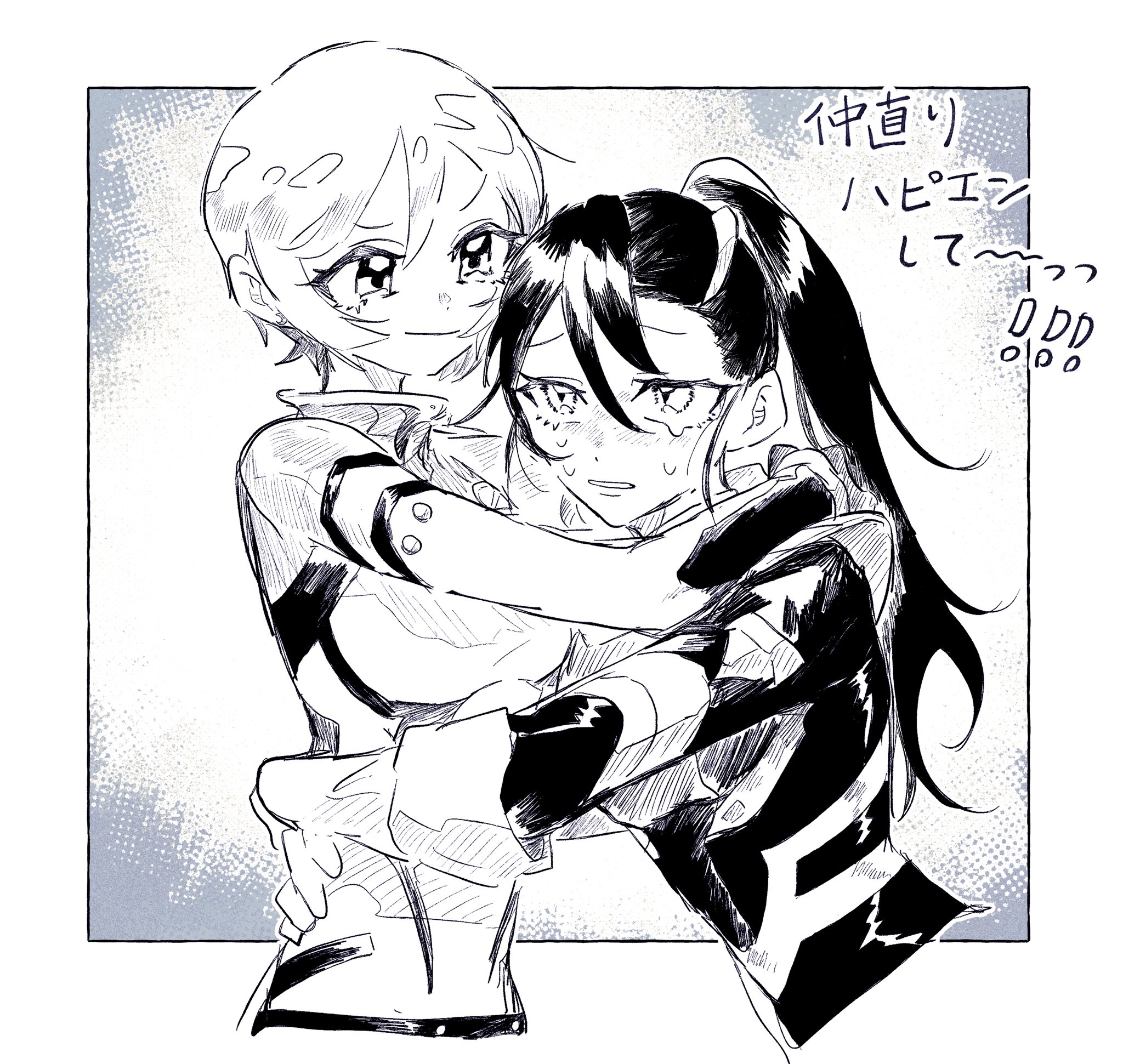 2girls amate_yuzuriha atsuage_(amo91958757) blush cropped_torso crying greyscale gundam gundam_gquuuuuux hair_ornament hairclip highres hug mecha_pilot_suit monochrome multiple_girls normal_suit_(gundam) nyaan_(gundam_gquuuuuux) ponytail short_hair
