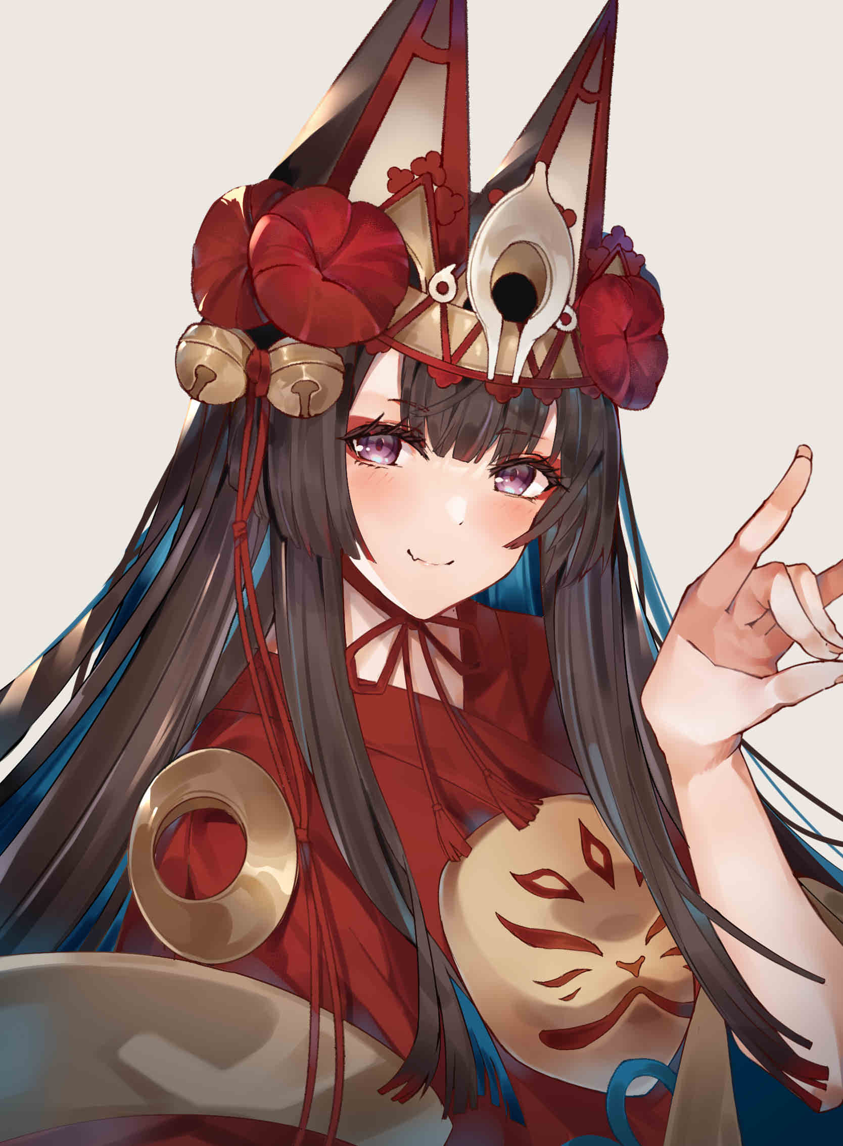 1girl black_hair blush closed_mouth crown flower fox_mask fox_shadow_puppet ginsetsu_(shadowverse) hair_between_eyes hair_flower hair_ornament highres japanese_clothes kimono lingyan_heiye long_hair looking_at_viewer mask purple_eyes red_flower red_kimono shadowverse sidelocks smile solo upper_body