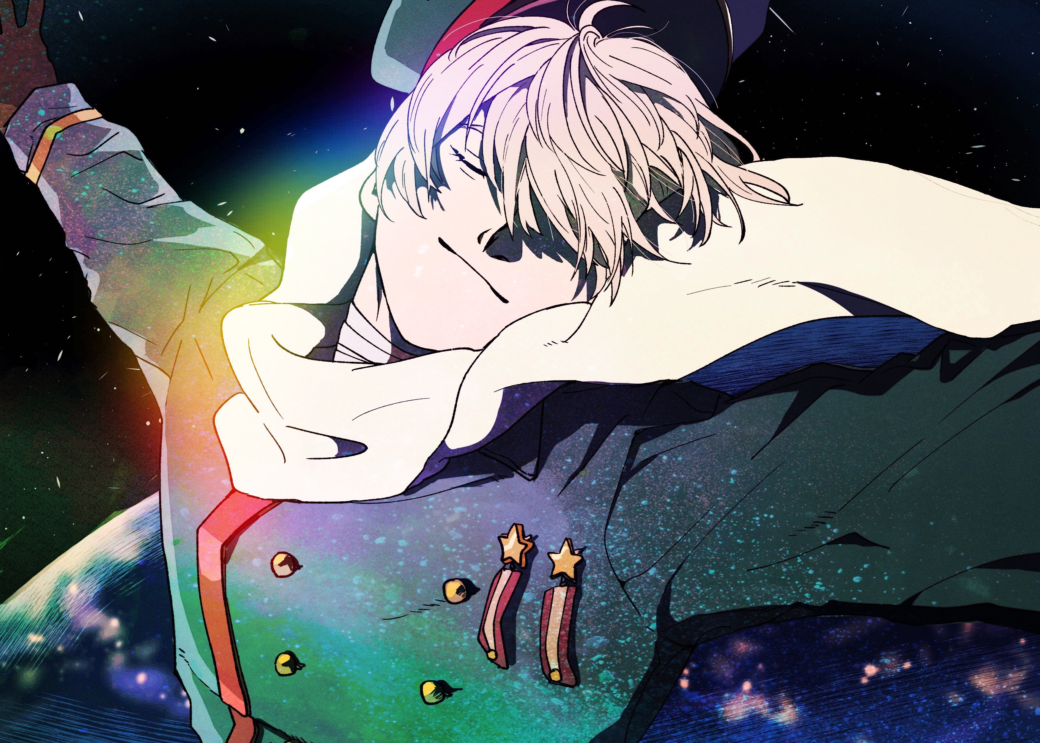 1boy absurdres arms_up axis_powers_hetalia bandaged_neck bandages black_sky brown_gloves buttons closed_eyes closed_mouth earth_(planet) floating_clothes gloves green_hat green_jacket hair_over_one_eye hat highres jacket long_sleeves male_focus medal military_hat military_jacket military_uniform outdoors outstretched_arms planet re02ri russia_(hetalia) scarf short_hair sky smile solo space spread_arms star_(sky) star_ornament starry_sky upper_body white_hair white_scarf