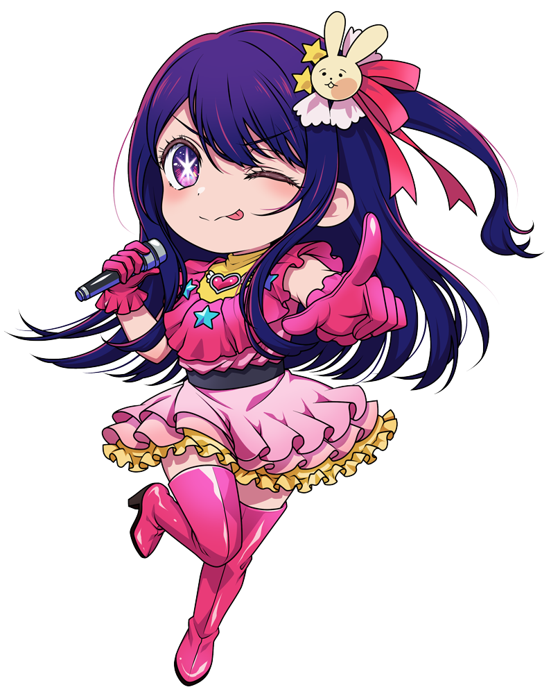 1girl ;p blush boots bright_pupils chibi chibi_only closed_mouth dress eyelashes floating_hair gloves hair_between_eyes hair_ornament hair_ribbon hands_up high_heel_boots high_heels holding holding_microphone hoshino_ai idol idol_clothes index_finger_raised knees_together_feet_apart long_hair looking_at_viewer microphone one_eye_closed one_side_up oshi_no_ko petticoat pink_boots pink_dress pink_gloves pointing pointing_at_viewer purple_eyes purple_hair rabbit_hair_ornament red_ribbon ribbon short_dress simple_background smile solo split_mouth standing standing_on_one_leg star-shaped_pupils star_(symbol) sukiyaki_(sukiyaki-jp) symbol-shaped_pupils tareme thigh_boots thighhighs tongue tongue_out transparent_background v-shaped_eyebrows white_pupils zettai_ryouiki