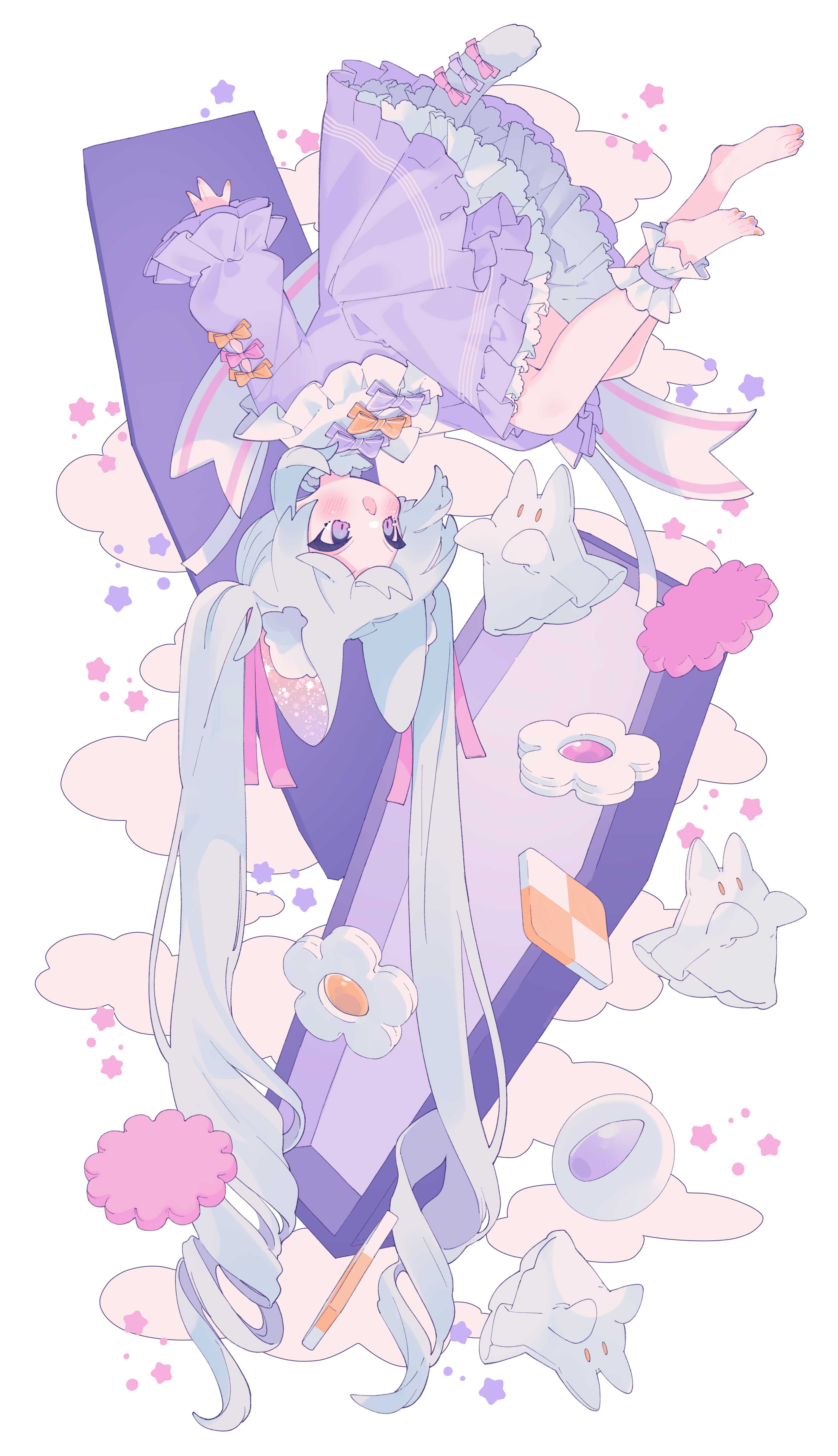 1girl absurdres animal_ear_fluff animal_ears ankle_cuffs barefoot bib_collar blush bow cat_ears cat_girl cat_tail checkerboard_cookie cloud coffin commentary cookie dated_commentary dress fang food frilled_dress frilled_sleeves frills full_body hair_ribbon highres long_hair long_sleeves nail_polish open_mouth orange_bow orange_nails original ozreiji petticoat pink_bow pink_eyes pink_ribbon purple_bow purple_dress purple_nails ribbon sheet_ghost skin_fang solo star_(symbol) untranslatable_commentary tail tail_bow tail_ornament toenail_polish toenails twintails upside-down variant_set very_long_hair white_hair