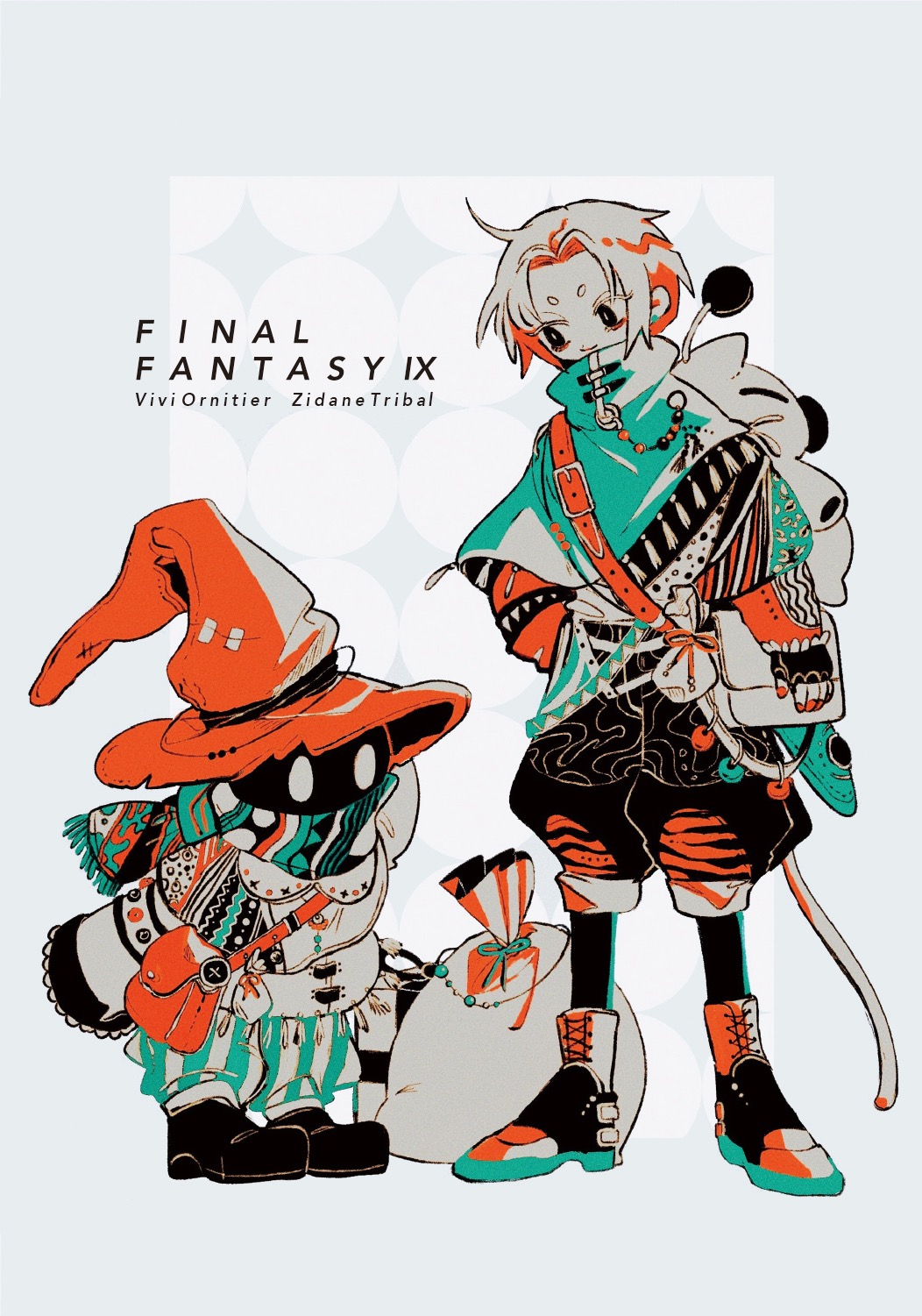 2boys bag black_gloves black_mage_(final_fantasy) boots character_name cloak copyright_name cowlick curtained_hair final_fantasy final_fantasy_ix full_body gloves glowing glowing_eyes green_scarf grey_background hat highres limited_palette looking_at_another looking_at_object monkey_tail moogle multicolored_scarf multiple_boys nayo_(kr_000515) orange_nails orange_scarf pants parted_bangs pouch puffy_shorts sack scarf shoes shorts shoulder_bag standing striped_clothes striped_pants tail vivi_ornitier white_background white_eyes wizard_hat zidane_tribal
