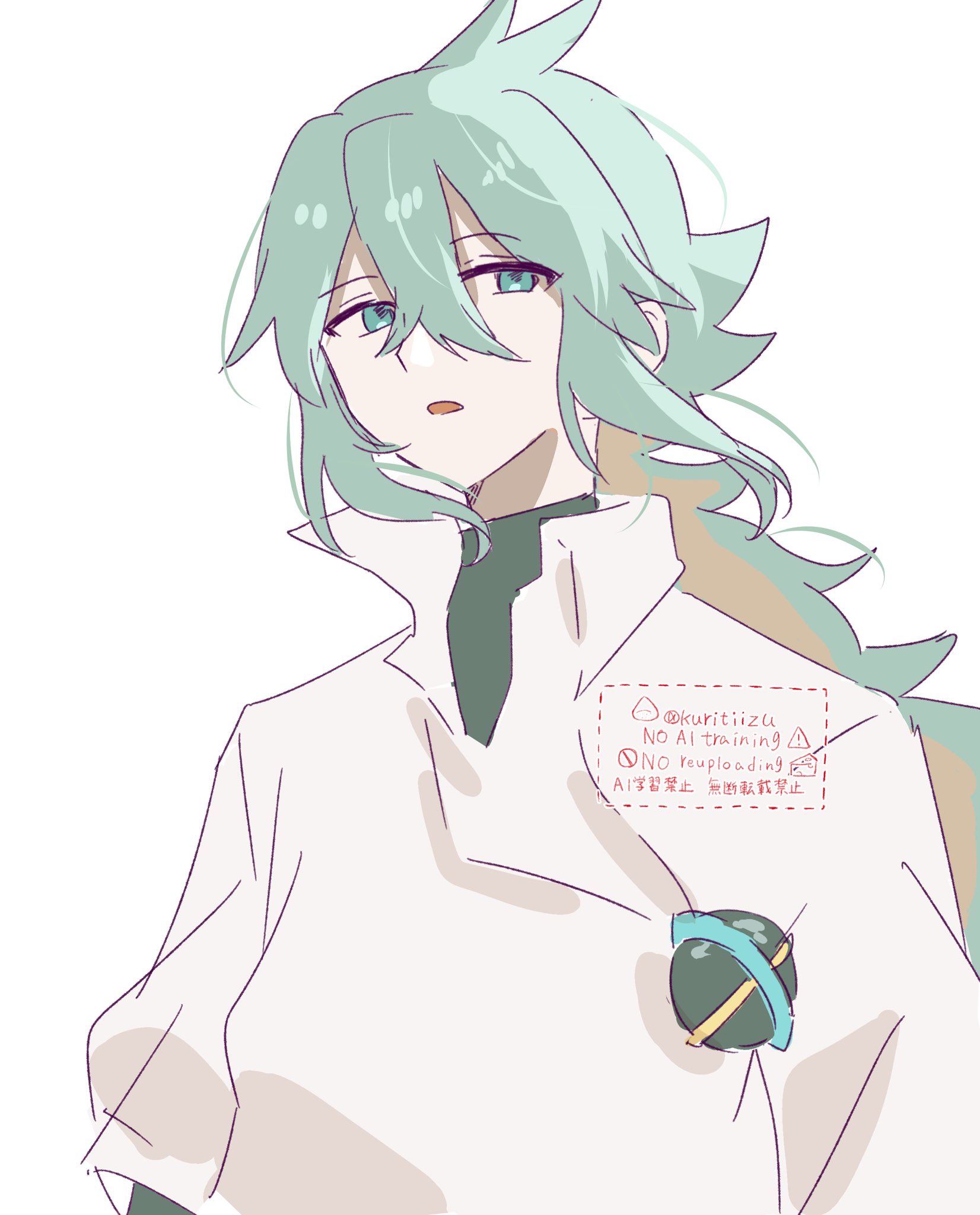 1boy :o green_eyes green_hair hair_between_eyes highres kuritiizu long_bangs long_hair looking_at_viewer male_focus n_(pokemon) nintendo open_mouth pokemon pokemon_black_and_white shirt solo undershirt upper_body white_background white_shirt