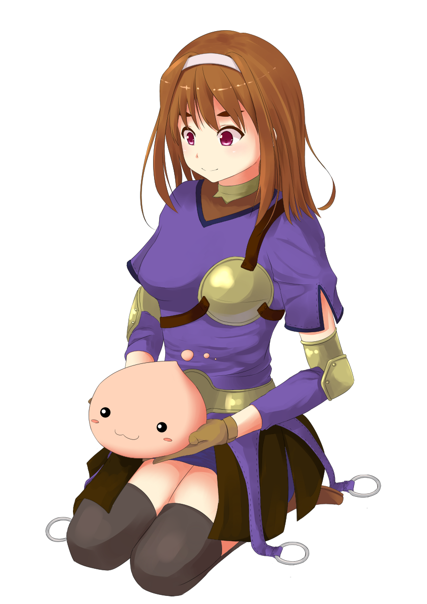 1girl :3 archer_(ragnarok_online) armored_skirt belt black_thighhighs blush boots breasts brown_boots brown_gloves brown_hair closed_mouth commentary_request creature full_body gloves hairband highres holding holding_creature kurohachiboku long_hair looking_down medium_breasts muneate poring purple_eyes purple_shirt ragnarok_online seiza shirt short_sleeves sitting slime_(creature) smile solo thick_eyebrows thighhighs white_hairband