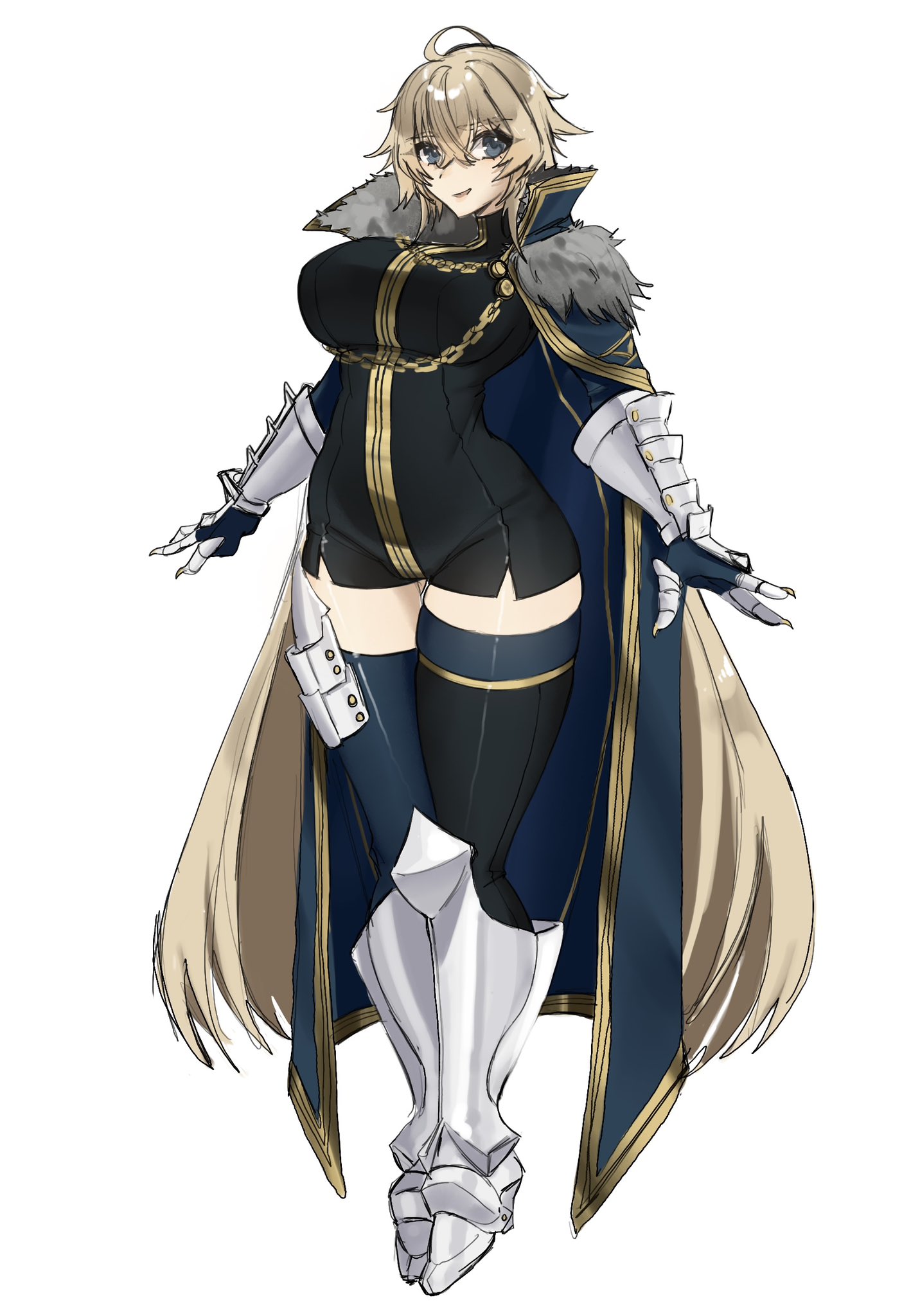 13addendum 1girl ahoge armor armored_boots blonde_hair blue_eyes boots breasts cape chain fate/extra fate_(series) fur_trim gauntlets gawain_(fate) gawain_(third_ascension)_(fate) genderswap gold_chain highres large_breasts looking_at_viewer short_hair simple_background smile solo thighhighs wada_arco_(style) white_background zettai_ryouiki