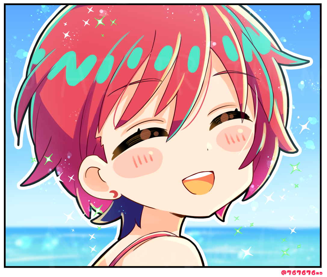 1girl ^_^ amate_yuzuriha artist_name blurry blurry_background blush blush_stickers border closed_eyes from_side gundam gundam_gquuuuuux namu76 ocean open_mouth outdoors red_hair short_hair smile solo sparkle strap teeth upper_teeth_only white_border