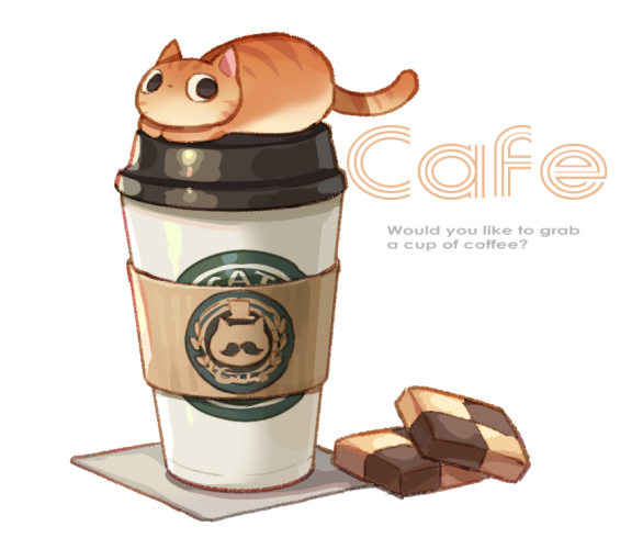 cat checkerboard_cookie commentary_request cookie cup disposable_coffee_cup disposable_cup english_text food food_focus no_humans original simple_background suzaku_(zaku6584) white_background