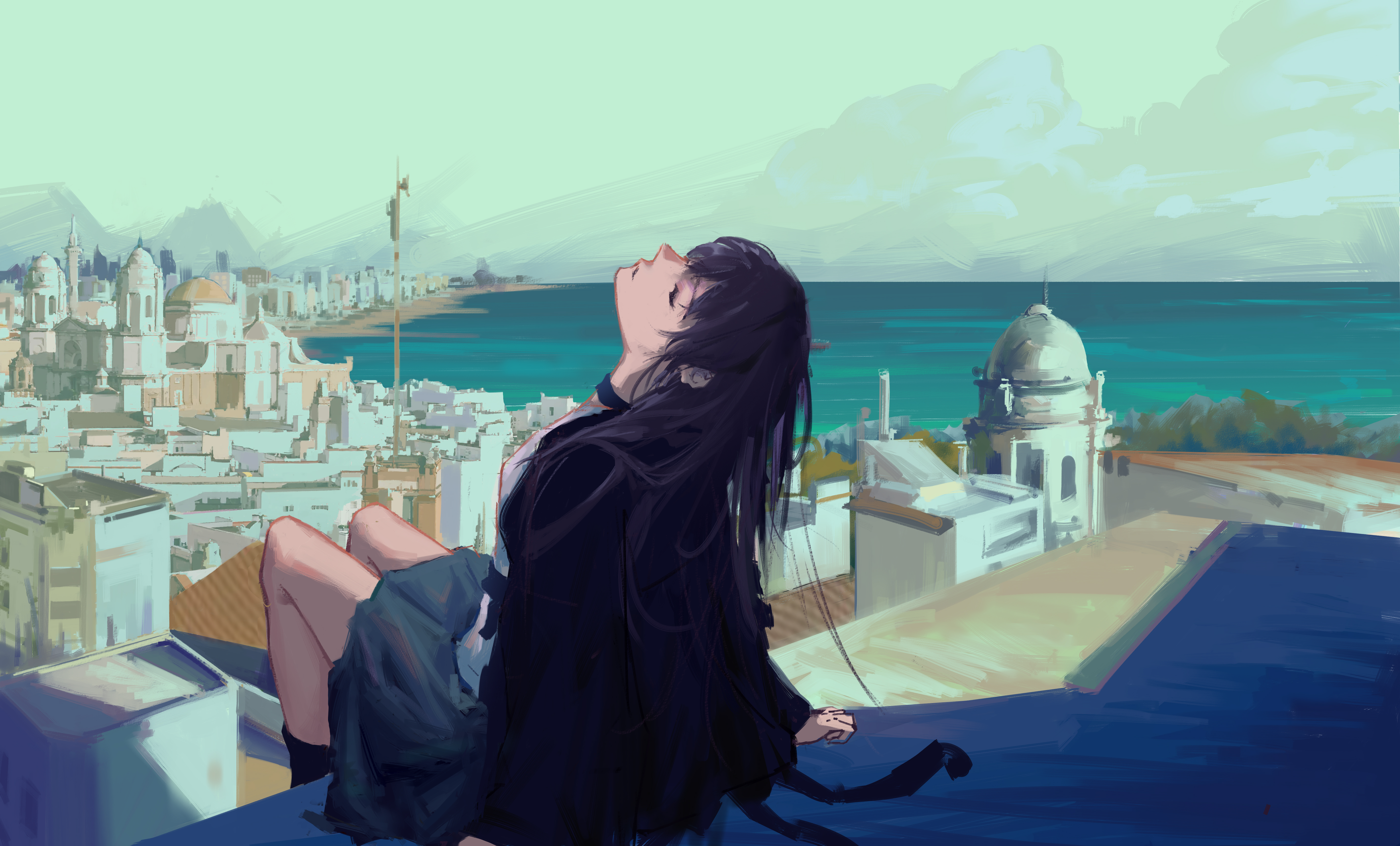 1girl absurdres arm_support arms_at_sides beach black_choker black_hair black_jacket choker city cityscape closed_eyes closed_mouth cloud commentary day dome english_commentary facing_up full_body grey_skirt highres jacket long_hair meteorecho ocean on_rooftop open_clothes open_jacket original outdoors rooftop sand scenery shade shadow shirt sitting skirt solo sunlight tower tree white_shirt
