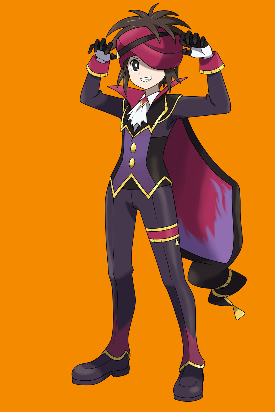 1boy arms_up asatsuki_(fgfff) ascot bright_pupils brown_eyes brown_hair cape commentary_request cosplay full_body gloves grin happy headband_over_one_eye highres jacket long_sleeves male_focus morty_(fall_2021)_(pokemon) morty_(pokemon) morty_(pokemon)_(cosplay) nate_(pokemon) nintendo orange_background pants pokemon pokemon_black_2_and_white_2 pokemon_masters_ex shoes short_hair simple_background smile solo standing teeth white_ascot white_pupils