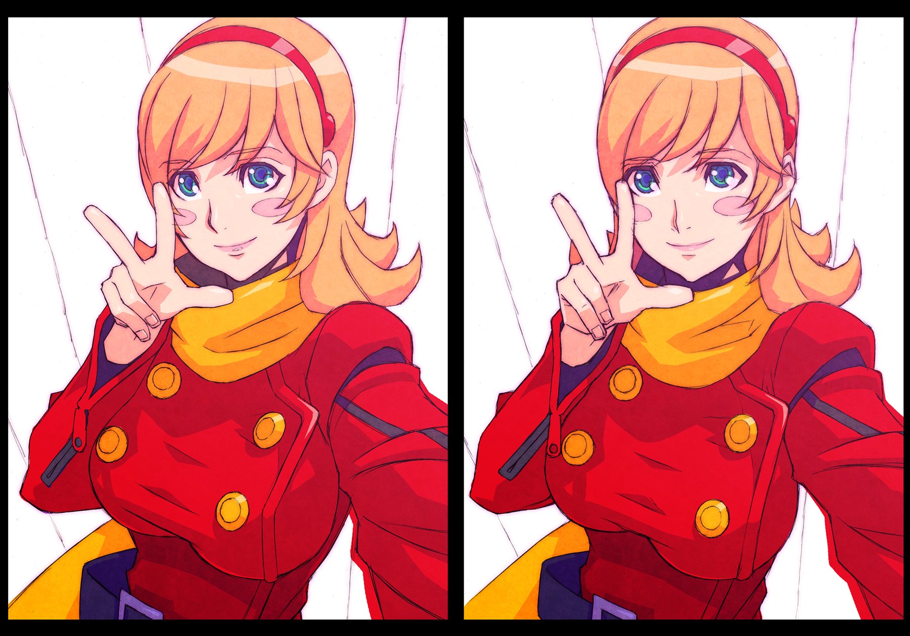 1girl belt blonde_hair blue_eyes blush_stickers breasts closed_mouth coat cyborg_009 francoise_arnoul hairband highres kotobuki_tsukasa long_hair looking_at_viewer red_coat red_hairband scarf smile solo v yellow_scarf