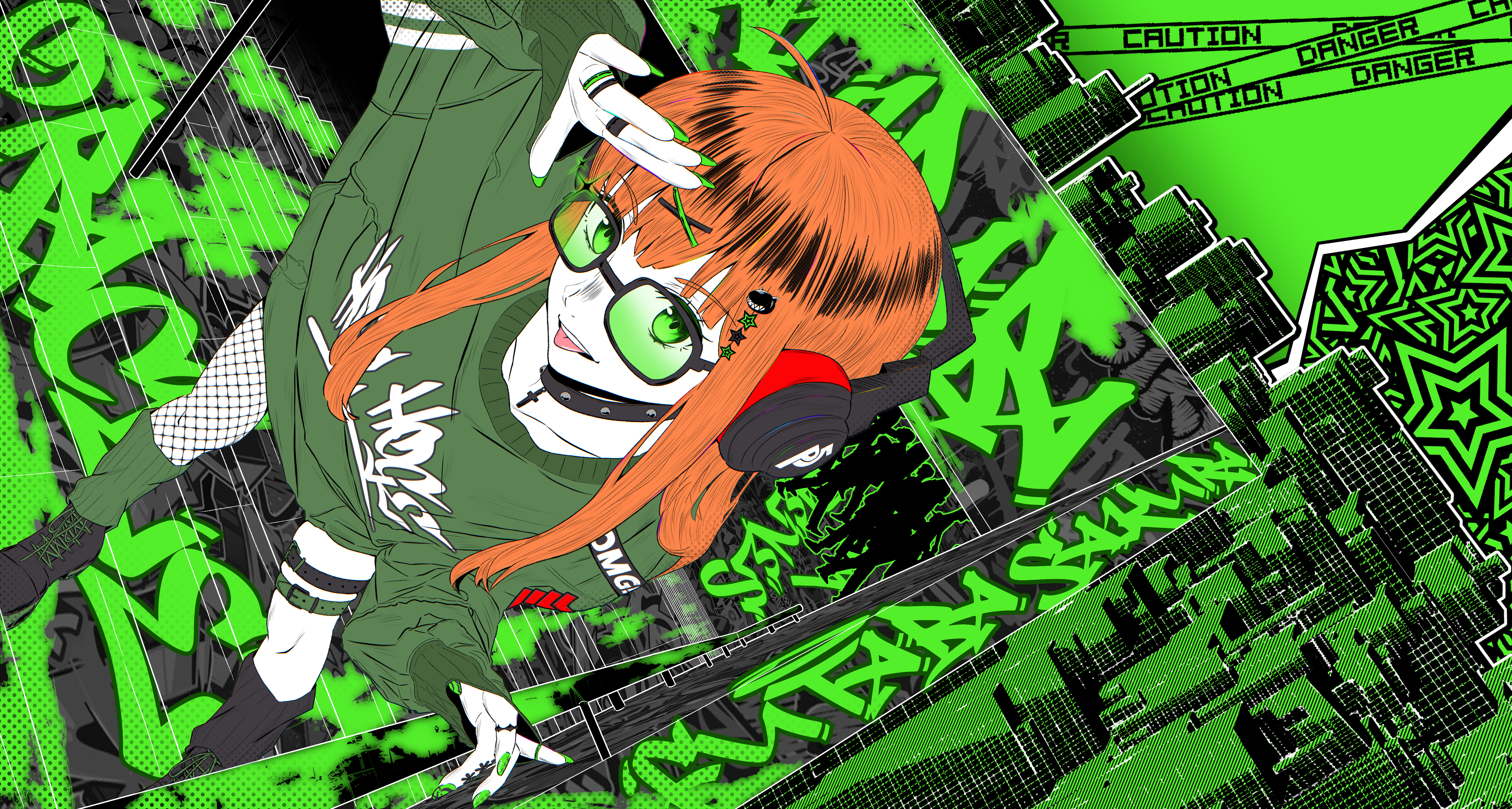 1girl absurdres ahoge alternate_eye_color arm_up asymmetrical_legwear behind-the-head_headphones black_collar black_shoes brown_hair caution_tape character_name collar cross_pendant fishnet_pantyhose fishnets glasses green-tinted_eyewear green_background green_eyes green_nails green_sweater hair_ornament headphones highres jewelry leaning_forward long_hair looking_at_viewer may_(may_lee8) mismatched_legwear orange_hair pantyhose parted_lips persona persona_5 ring sakura_futaba shoes single_leg_pantyhose solo sweater thigh_strap tinted_eyewear tongue tongue_out x_hair_ornament