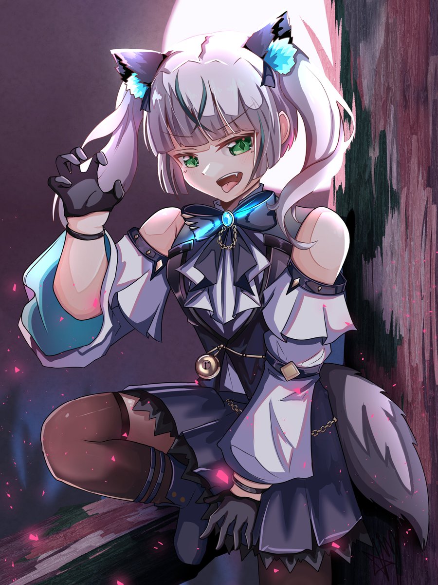 1girl animal_ear_fluff animal_ears black_thighhighs blunt_bangs bow frills green_eyes h_ans_(hmn_anz) hairband heaven_burns_red highres official_alternate_costume skirt solo sugawara_chie sugawara_chie_(feral_insanity) tail thighhighs twintails white_hair wolf_ears wolf_girl wolf_tail