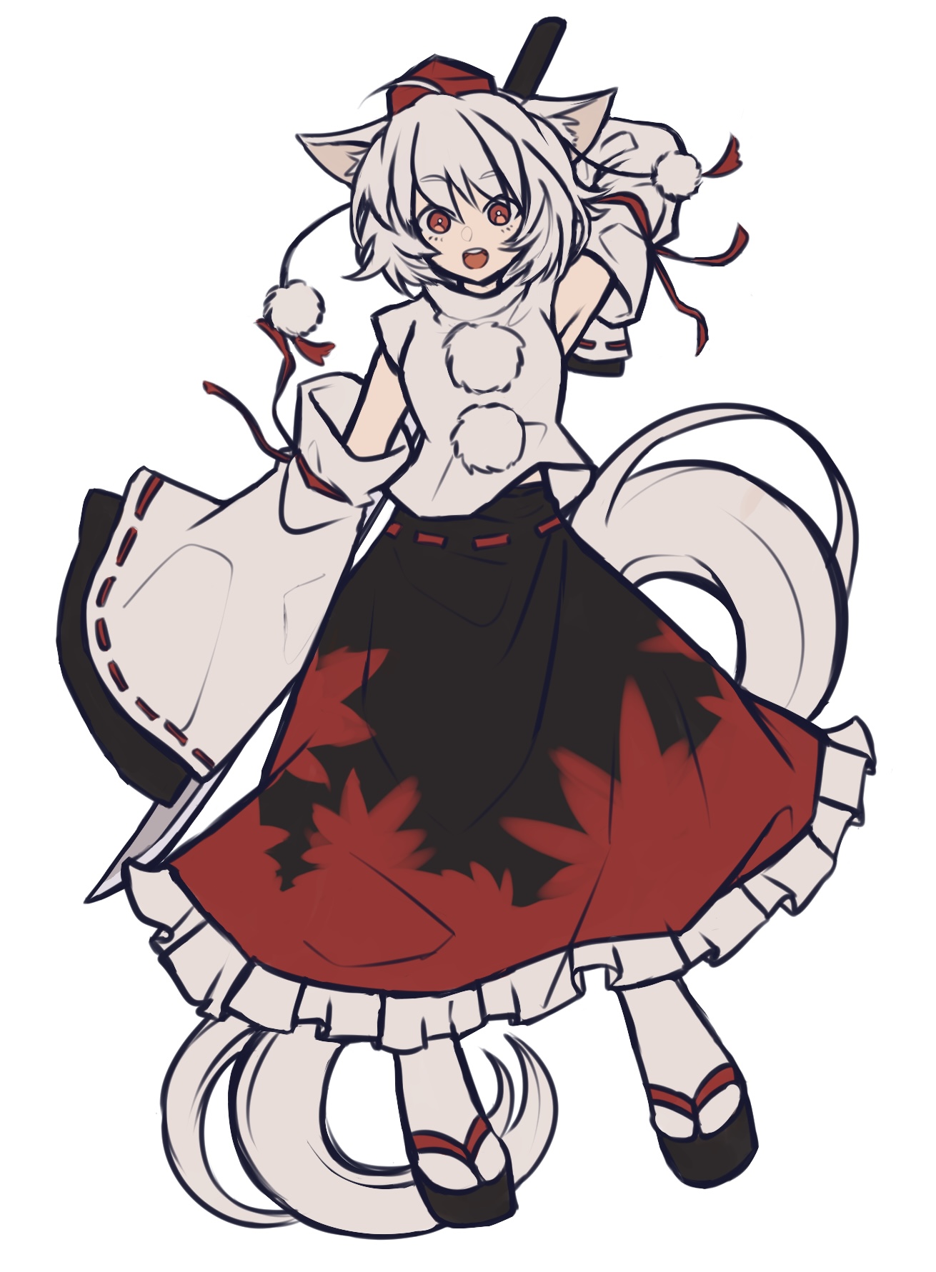1girl animal_ear_fluff animal_ears commentary detached_sleeves frilled_skirt frills full_body grey_hair hat highres holding holding_sword holding_weapon inubashiri_momiji leaf_print looking_at_viewer medium_hair open_mouth platform_sandals pom_pom_(clothes) print_skirt red_eyes ribbon-trimmed_sleeves ribbon_trim sandals simple_background skirt smile soda_(sodaa_811) solo sword tachi-e tail tokin_hat touhou weapon white_background wolf_ears wolf_girl wolf_tail