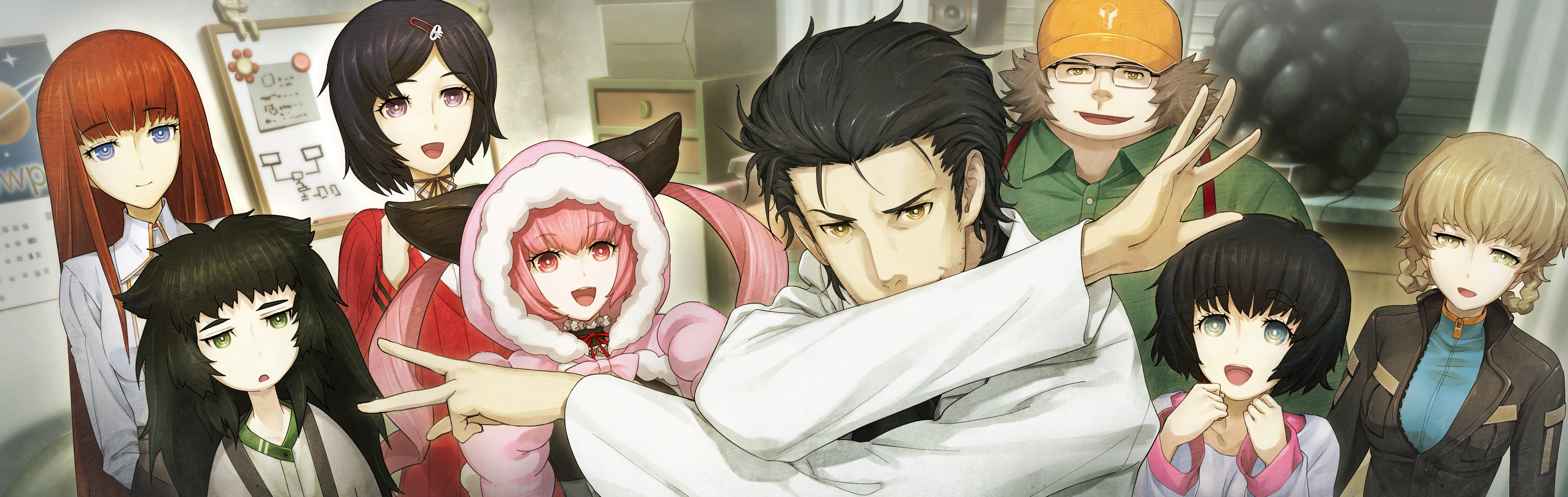 3boys 5girls absurdres akiha_rumiho amane_suzuha amane_suzuha_(beta) animal_costume black_hair blue_eyes brown_eyes brown_hair cat_costume game_cg glasses green_eyes hair_ornament hashida_itaru hat highres hiyajou_maho huke indoors lab_coat long_hair looking_at_viewer maid mayqueen_maid_uniform multiple_boys multiple_girls non-web_source official_art okabe_rintarou okabe_rintarou_(beta) open_mouth pink_hair purple_eyes red_eyes ringed_eyes science_adventure shiina_kagari shiina_mayuri short_hair steins;gate steins;gate_0 twintails urushibara_luka yellow_eyes